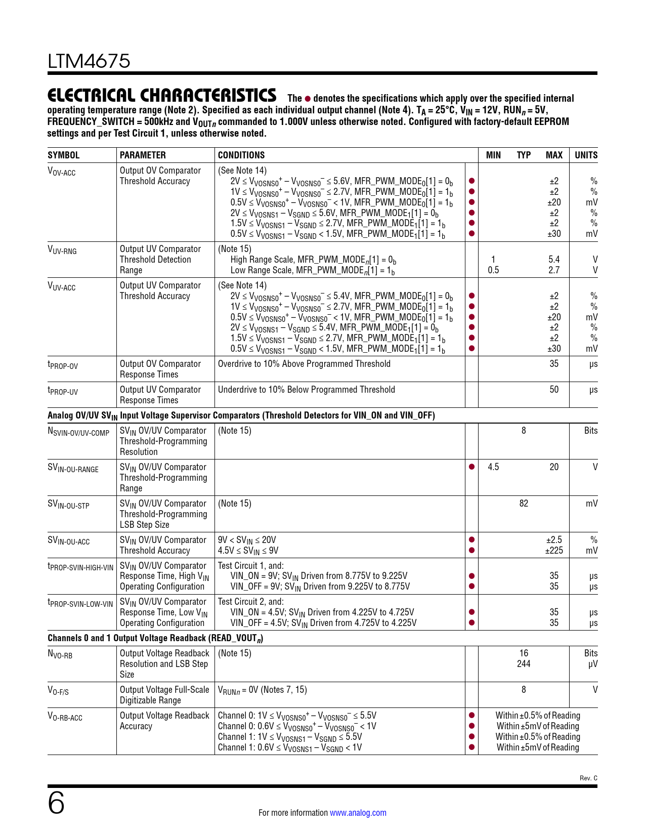 NVO-RB Output Voltage Readback (Note 15) 16 Bits Resolution and LSB Step 244 µV Size VO-F/S Output Voltage Full-Scale VRUNn = 0V (Notes 7, 15) 8 V Digitizable Range V + – O-RB-ACC Output Voltage Readback Channel 0: 1V ≤ VVOSNS0 – VVOSNS0 ≤ 5.5V l Within ±0.5% of Reading Accuracy Channel 0: 0.6V ≤ V + – VOSNS0 – VVOSNS0 < 1V l Within ±5mV of Reading Channel 1: 1V ≤ V VOSNS1 – VSGND ≤ 5.5V l Within ±0.5% of Reading Channel 1: 0.6V ≤ VVOSNS1 – VSGND < 1V l Within ±5mV of Reading Rev. C 6 For more information www.analog.com Document Outline Features Applications Typical Application Description Absolute Maximum Ratings Order Information Pin Configuration Electrical Characteristics Typical Performance Characteristics Pin Functions Simplified Block Diagram Decoupling Requirements Functional Diagram Test Circuits Operation Power Module Introduction Power Module Configurability and Readback Data Time-Averaged and Peak Readback Data Power Module Overview EEPROM Serial Interface Device Addressing Fault Detection and Handling Responses to VOUT and IOUT Faults Responses to Timing Faults Responses to SVIN OV Faults Responses to OT/UT Faults Responses to External Faults Fault Logging Bus Timeout Protection PMBus Command Summary PMBus Commands Applications Information VIN to VOUT Step-Down Ratios Input Capacitors Output Capacitors Light Load Current Operation Switching Frequency and Phase Minimum On-Time Considerations Variable Delay Time, Soft-Start and Output Voltage Ramping Digital Servo Mode Soft Off (Sequenced Off) Undervoltage Lockout Fault Detection and Handling Open-Drain Pins Phase-Locked Loop and Frequency Synchronization RCONFIG Pin-Straps (External Resistor Configuration Pins) Voltage Selection Connecting the USB to the I2C/SMBus/PMBus Controller to the LTM4675 In System LTpowerPlay: An Interactive GUI for Digital Power System Management PMBus Communication and Command Processing Thermal Considerations and Output Current Derating EMI Performance Safety Considerations Layout Checklist/Example Typical Applications Appendix A Similarity Between PMBus, SMBus and I2C 2-Wire Interface Appendix B PMBus Serial Digital Interface Appendix C: PMBus Command Details Addressing and Write Protect General Configuration Registers On/Off/Margin PWM Config Voltage Current Temperature Timing Fault Response Fault Sharing Scratchpad Identification Fault Warning and Status Telemetry NVM (EEPROM) Memory Commands Package Description Package Photograph Package Description Revision History Typical Application Design Resources Related Parts