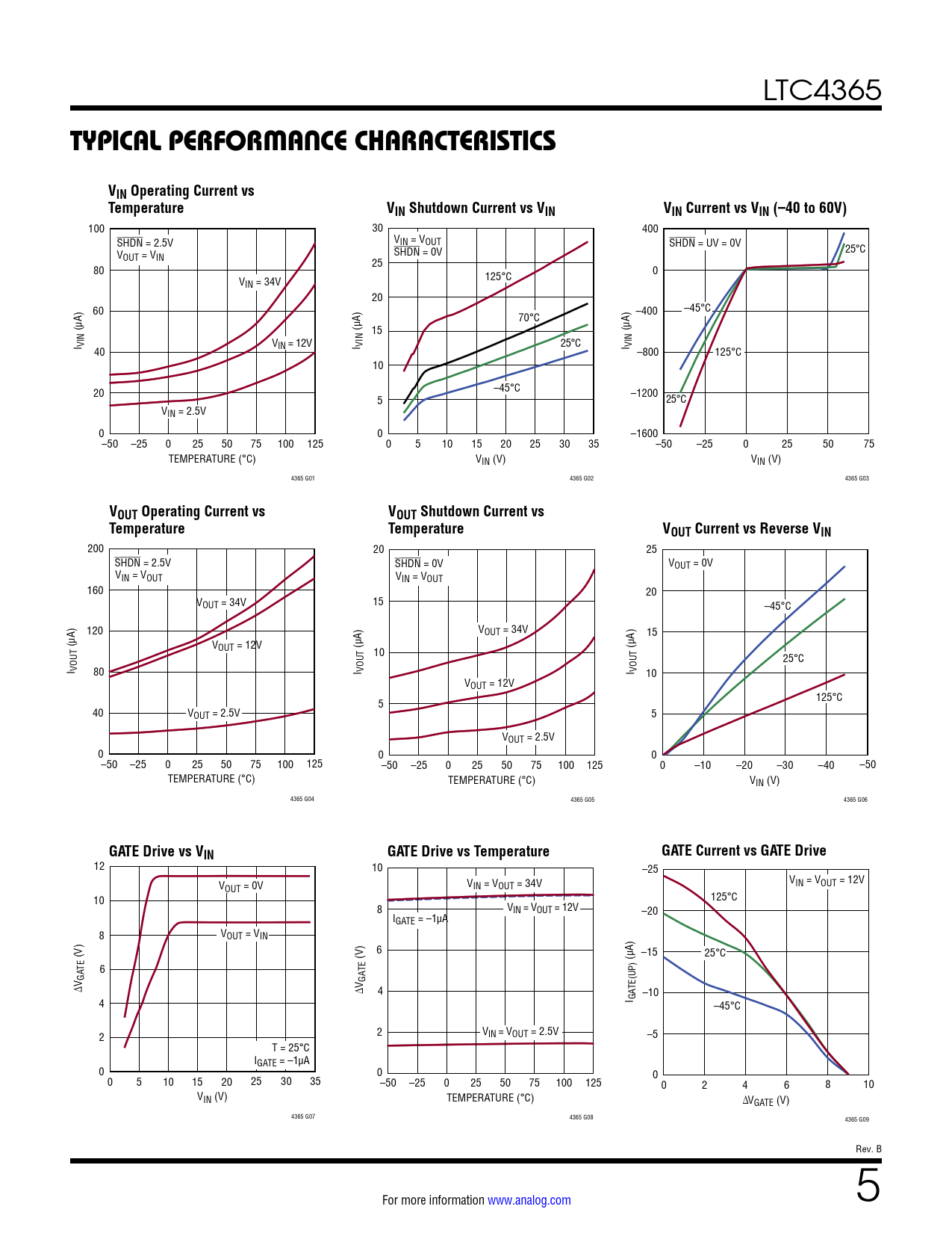 200 20 25 SHDN = 2.5V SHDN = 0V VOUT = 0V VIN = VOUT VIN = VOUT 160 20 VOUT = 34V 15 –45°C 120 VOUT = 34V 15 (µA) VOUT = 12V (µA) 10 (µA) 25°C I VOUT 80 I VOUT I VOUT 10 VOUT = 12V 125°C 5 40 VOUT = 2.5V 5 VOUT = 2.5V 0 0 0 –50 –25 0 25 50 75 100 125 –50 –25 0 25 50 75 100 125 0 –10 –20 –30 –40 –50 TEMPERATURE (°C) TEMPERATURE (°C) VIN (V) 4365 G04 4365 G05 4365 G06