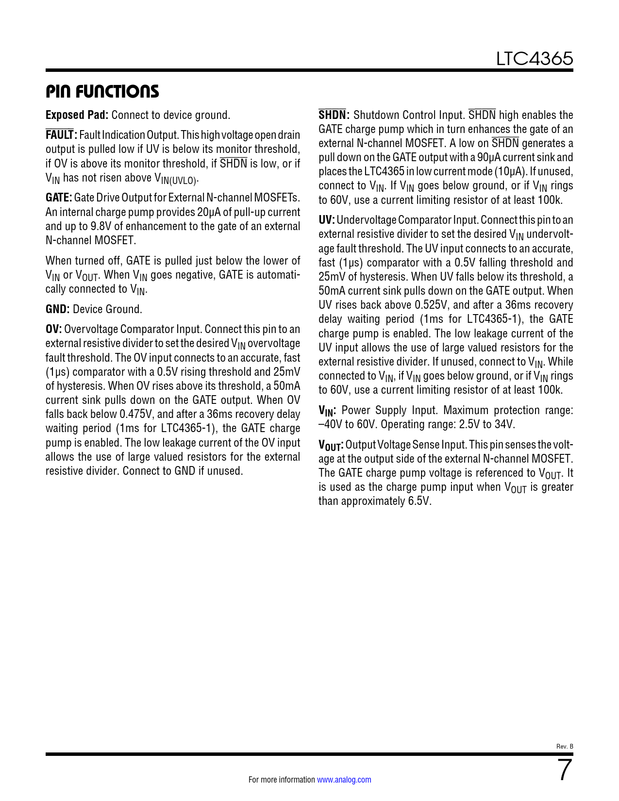 LTC4365 PIN FUNCTIONS Exposed Pad: Connect to device ground. SHDN: Shutdown Control Input. SHDN high enables the FAULT: Fault Indication Output. This high voltage open drain GATE charge pump which in turn enhances the gate of an output is pulled low if UV is below its monitor threshold, external N-channel MOSFET. A low on SHDN generates a if OV is above its monitor threshold, if SHDN is low, or if pull down on the GATE output with a 90µA current sink and V places the LTC4365 in low current mode (10µA). If unused, IN has not risen above VIN(UVLO). connect to VIN. If VIN goes below ground, or if VIN rings GATE: Gate Drive Output for External N-channel MOSFETs. to 60V, use a current limiting resistor of at least 100k. An internal charge pump provides 20µA of pull-up current and up to 9.8V of enhancement to the gate of an external UV: Undervoltage Comparator Input. Connect this pin to an N-channel MOSFET. external resistive divider to set the desired VIN undervolt- age fault threshold. The UV input connects to an accurate, When turned off, GATE is pulled just below the lower of fast (1µs) comparator with a 0.5V falling threshold and VIN or VOUT. When VIN goes negative, GATE is automati- 25mV of hysteresis. When UV falls below its threshold, a cally connected to VIN. 50mA current sink pulls down on the GATE output. When GND: Device Ground. UV rises back above 0.525V, and after a 36ms recovery delay waiting period (1ms for LTC4365-1), the GATE OV: Overvoltage Comparator Input. Connect this pin to an charge pump is enabled. The low leakage current of the external resistive divider to set the desired VIN overvoltage UV input allows the use of large valued resistors for the fault threshold. The OV input connects to an accurate, fast external resistive divider. If unused, connect to V (1µs) comparator with a 0.5V rising threshold and 25mV IN. While connected to V of hysteresis. When OV rises above its threshold, a 50mA IN, if VIN goes below ground, or if VIN rings to 60V, use a current limiting resistor of at least 100k. current sink pulls down on the GATE output. When OV falls back below 0.475V, and after a 36ms recovery delay VIN: Power Supply Input. Maximum protection range: waiting period (1ms for LTC4365-1), the GATE charge –40V to 60V. Operating range: 2.5V to 34V. pump is enabled. The low leakage current of the OV input VOUT: Output Voltage Sense Input. This pin senses the volt- allows the use of large valued resistors for the external age at the output side of the external N-channel MOSFET. resistive divider. Connect to GND if unused. The GATE charge pump voltage is referenced to VOUT. It is used as the charge pump input when VOUT is greater than approximately 6.5V. Rev. B For more information www.analog.com 7 Document Outline Features Applications Typical Application Description Absolute Maximum Ratings Pin Configuration Order Information Electrical Characteristics Typical Performance Characteristics Pin Functions Block Diagram Operation Applications Information Package Description Revision History Typical Application Related Parts