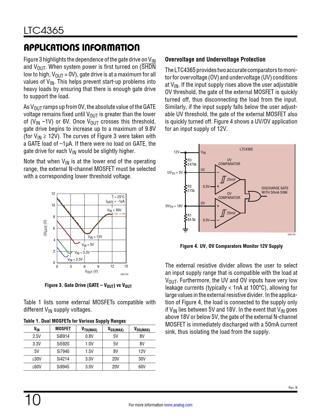 link to page 10 link to page 10 link to page 10 link to page 10 LTC4365 APPLICATIONS INFORMATION Figure 3 highlights the dependence of the gate drive on VIN Overvoltage and Undervoltage Protection and VOUT. When system power is first turned on (SHDN The LTC4365 provides two accurate comparators to moni- low to high, VOUT = 0V), gate drive is at a maximum for all tor for overvoltage (OV) and undervoltage (UV) conditions values of VIN. This helps prevent start-up problems into at VIN. If the input supply rises above the user adjustable heavy loads by ensuring that there is enough gate drive OV threshold, the gate of the external MOSFET is quickly to support the load. turned off, thus disconnecting the load from the input. As VOUT ramps up from 0V, the absolute value of the GATE Similarly, if the input supply falls below the user adjust- voltage remains fixed until VOUT is greater than the lower able UV threshold, the gate of the external MOSFET also of (VIN –1V) or 6V. Once VOUT crosses this threshold, is quickly turned off. Figure 4 shows a UV/OV application gate drive begins to increase up to a maximum of 9.8V for an input supply of 12V. (for VIN ≥ 12V). The curves of Figure 3 were taken with a GATE load of –1µA. If there were no load on GATE, the gate drive for each VIN would be slightly higher. LTC4365 12V VIN Note that when V R3 UV IN is at the lower end of the operating 2470k COMPARATOR range, the external N-channel MOSFET must be selected UV – with a corresponding lower threshold voltage. UVTH = 5V 25mV + R2 0.5V DISCHARGE GATE 215k WITH 50mA SINK 12 OV T = 25°C COMPARATOR IGATE = –1µA OV 10 OVTH = 18V + VIN = 30V R1 25mV 8 84.5k 0.5V – (V) 6 GATE 4365 F04 ∆V V 4 IN = 12V VIN = 5V Figure 4. UV, OV Comparators Monitor 12V Supply 2 VIN = 3.3V VIN = 2.5V 0 0 3 6 9 12 15 The external resistive divider allows the user to select VOUT (V) 4365 F03 an input supply range that is compatible with the load at VOUT. Furthermore, the UV and OV inputs have very low Figure 3. Gate Drive (GATE – VOUT) vs VOUT leakage currents (typically < 1nA at 100°C), allowing for large values in the external resistive divider. In the applica- Table 1 lists some external MOSFETs compatible with tion of Figure 4, the load is connected to the supply only different VIN supply voltages. if VIN lies between 5V and 18V. In the event that VIN goes above 18V or below 5V, the gate of the external N-channel Table 1. Dual MOSFETs for Various Supply Ranges MOSFET is immediately discharged with a 50mA current VINMOSFETVTH(MAX)VGS(MAX)VDS(MAX) sink, thus isolating the load from the supply. 2.5V SiB914 0.8V 5V 8V 3.3V Si5920 1.0V 5V 8V 5V Si7940 1.5V 8V 12V ≤30V Si4214 3.0V 20V 30V ≤60V Si9945 3.0V 20V 60V Rev. B 10 For more information www.analog.com Document Outline Features Applications Typical Application Description Absolute Maximum Ratings Pin Configuration Order Information Electrical Characteristics Typical Performance Characteristics Pin Functions Block Diagram Operation Applications Information Package Description Revision History Typical Application Related Parts