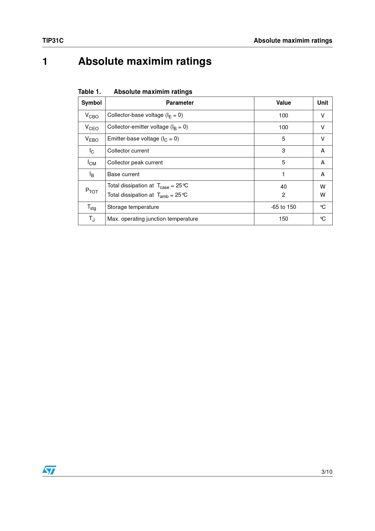 TIP31CAbsolute maximim ratings1Absolute maximim ratingsTable 1.Absolute maximim ratingsSymbolParameterValueUnit VCBO Collector-base voltage (IE = 0) 100 V VCEO Collector-emitter voltage (IB = 0) 100 V VEBO Emitter-base voltage (IC = 0) 5 V IC Collector current 3 A ICM Collector peak current 5 A IB Base current 1 A Total dissipation at Tcase = 25°C 40 W PTOT Total dissipation at Tamb = 25°C 2 W Tstg Storage temperature -65 to 150 °C TJ Max. operating junction temperature 150 °C 3/10
