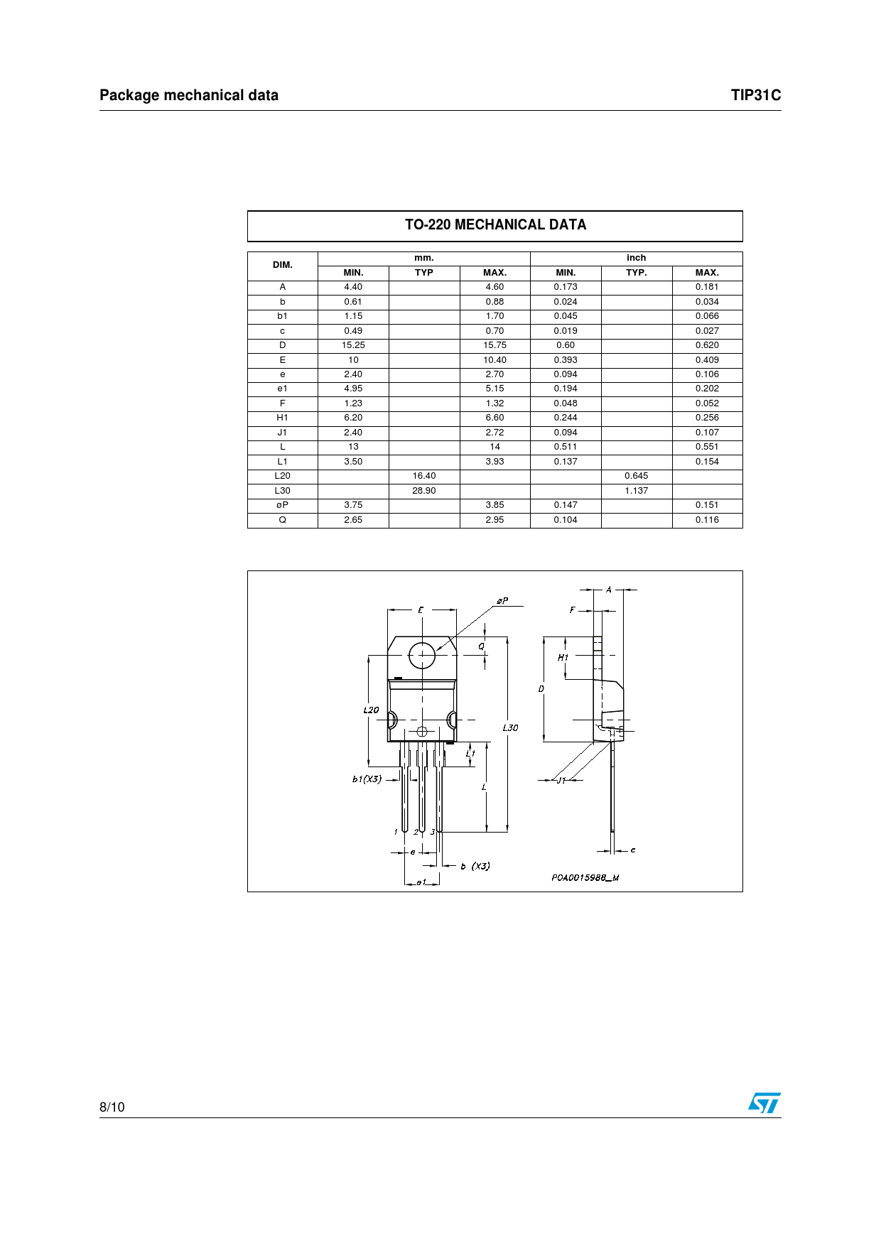 | Páginas / Página | 10 / 8 — Package mechanical data. TIP31C. TO-220 MECHANICAL DATA. mm. inch. DIM. … |