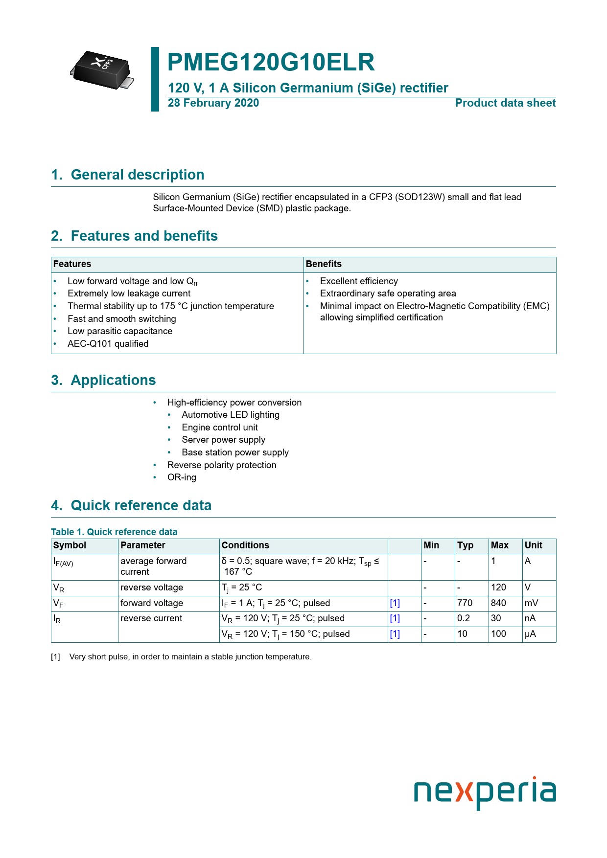 PMEG120G10ELR. 120 V, 1 A Silicon Germanium (SiGe) rectifier. 28 February 2020. Product data sheet. 1. General description