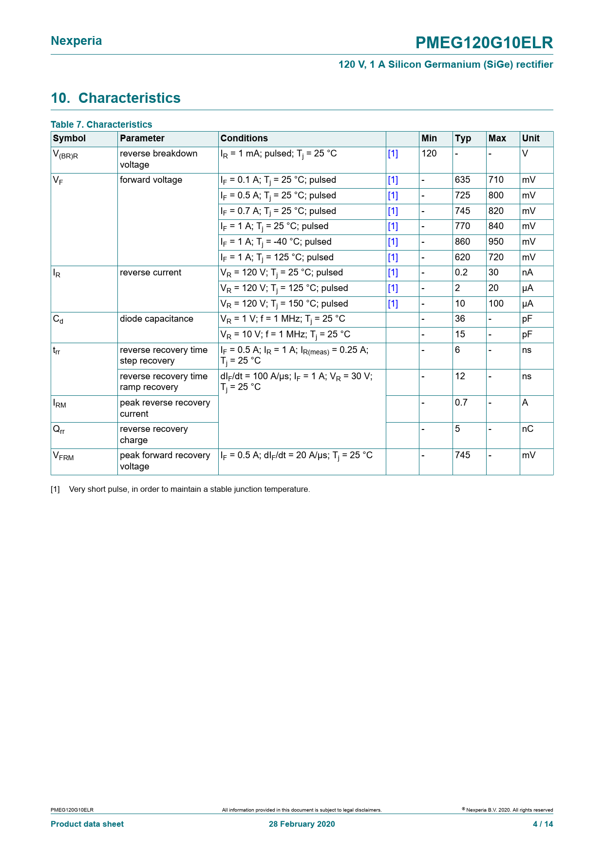 Nexperia. PMEG120G10ELR. 120 V, 1 A Silicon Germanium (SiGe) rectifier. 10. Characteristics Table 7. Characteristics. Symbol