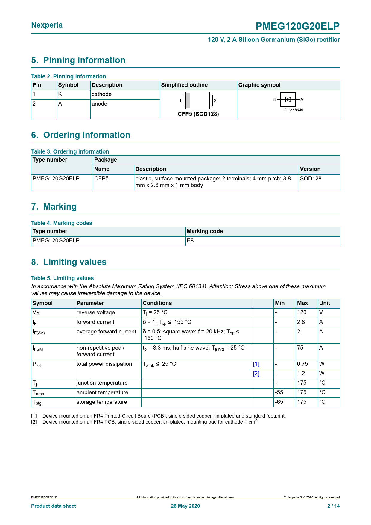 Nexperia. PMEG120G20ELP. 120 V, 2 A Silicon Germanium (SiGe) rectifier. 5. Pinning information Table 2. Pinning information