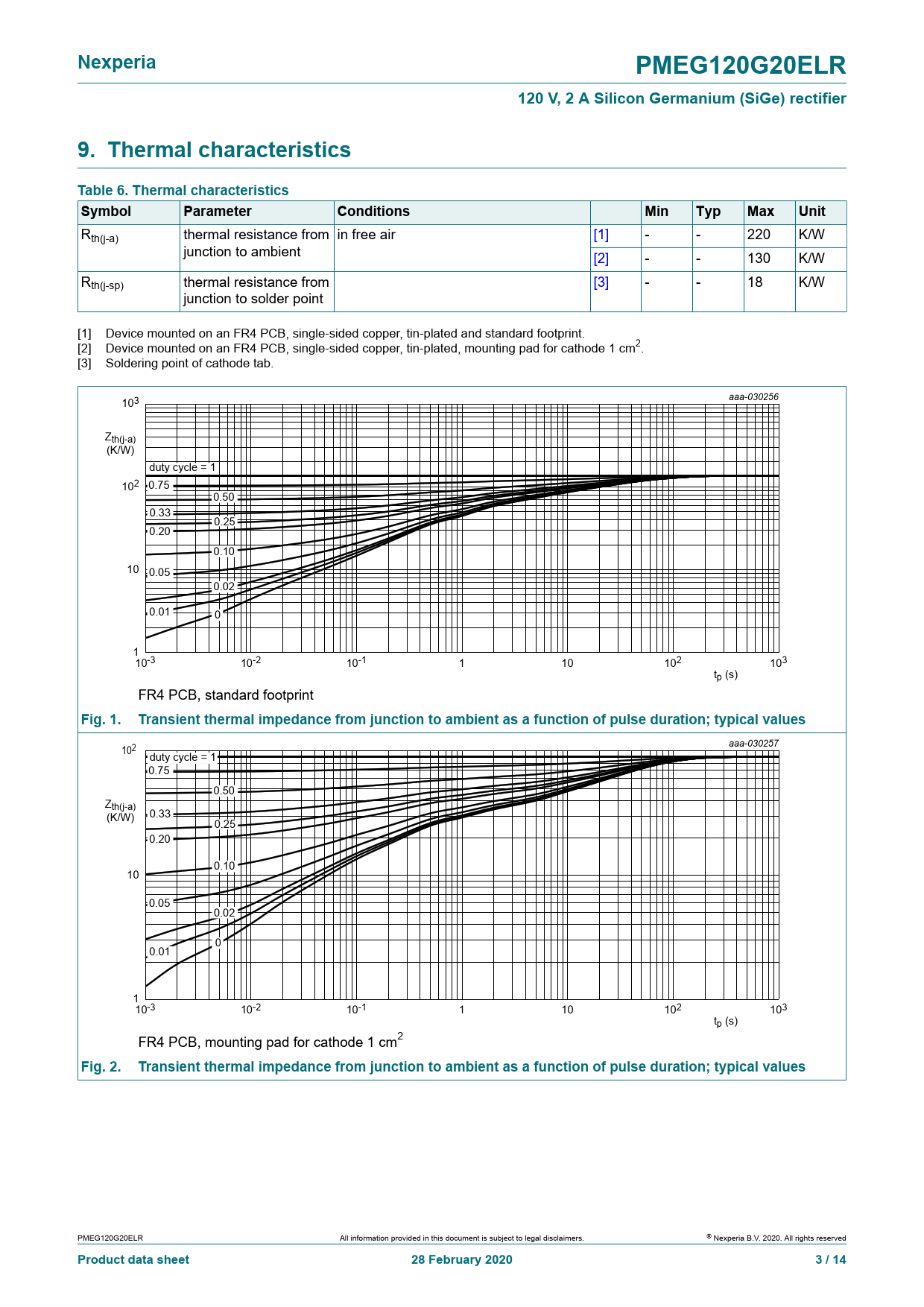 Nexperia PMEG120G20ELR 120 V, 2 A Silicon Germanium (SiGe) rectifier 9. Thermal characteristics Table 6. Thermal characteristics Symbol Parameter Conditions Min Typ Max Unit