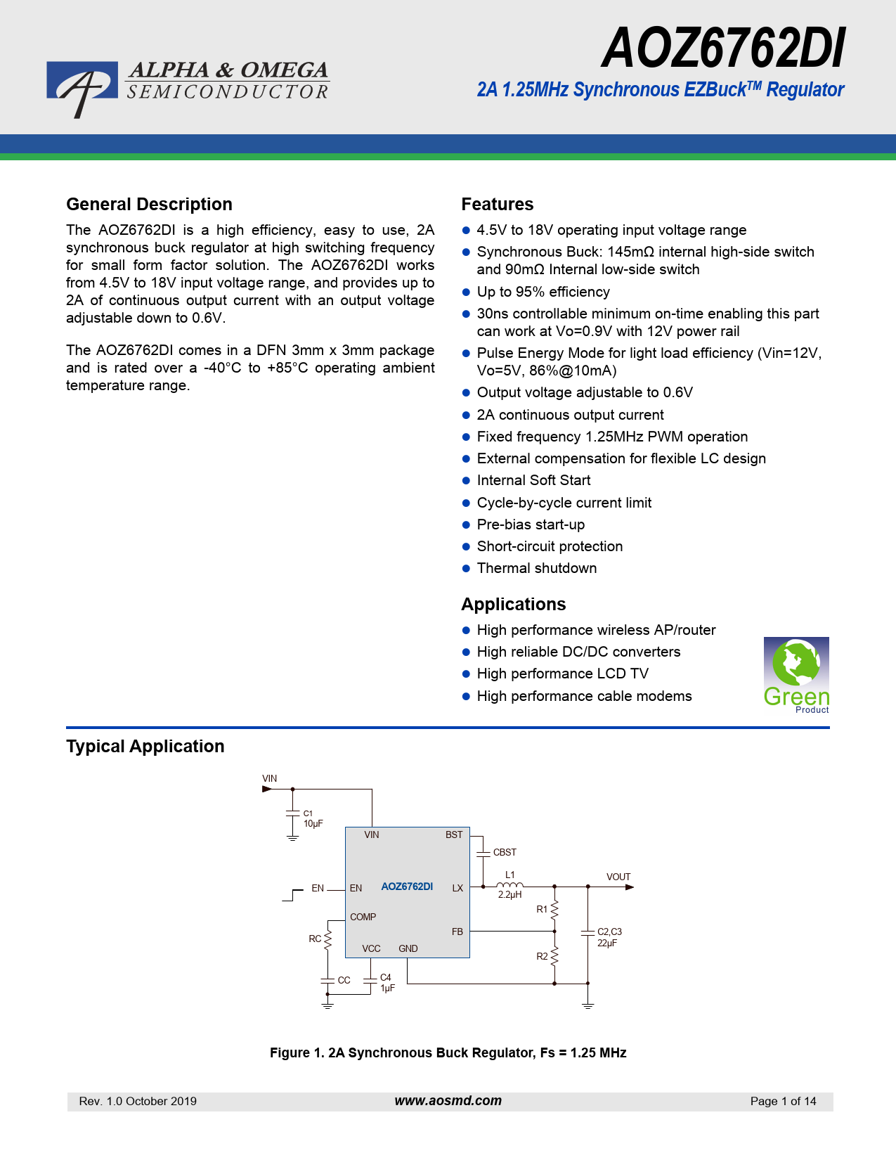 AOZ6762DI. 2A 1.25MHz Synchronous EZBuckTM Regulator. General Description. Features. Applications. Typical Application