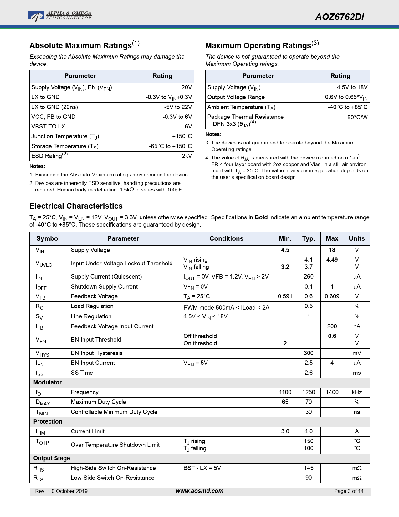 AOZ6762DIAbsolute Maximum Ratings (1) Maximum Operating Ratings (3) Exceeding the Absolute Maximum Ratings may damage the The device is not guaranteed to operate beyond the device. Maximum Operating ratings. ParameterRatingParameterRating Supply Voltage (VIN), EN (VEN) 20V Supply Voltage (VIN) 4.5V to 18V LX to GND -0.3V to VIN+0.3V Output Voltage Range 0.6V to 0.65*VIN LX to GND (20ns) -5V to 22V Ambient Temperature (TA) -40°C to +85°C VCC, FB to GND -0.3V to 6V Package Thermal Resistance 50°C/W VBST TO LX 6V DFN 3x3 (θJA)(4) Notes: Junction Temperature (TJ) +150°C 3. The device is not guaranteed to operate beyond the Maximum Storage Temperature (TS) -65°C to +150°C Operating ratings. ESD Rating(2) 2kV 4. The value of θJA is measured with the device mounted on a 1-in2 Notes: FR-4 four layer board with 2oz copper and Vias, in a still air environ- ment with T 1. Exceeding the Absolute Maximum ratings may damage the device. A = 25°C. The value in any given application depends on the user’s specification board design. 2. Devices are inherently ESD sensitive, handling precautions are required. Human body model rating: 1.5k in series with 100pF. Electrical Characteristics TA = 25°C, VIN = VEN = 12V, VOUT = 3.3V, unless otherwise specified. Specifications in Bold indicate an ambient temperature range of -40°C to +85°C. These specifications are guaranteed by design. SymbolParameterConditionsMin.Typ.MaxUnits VIN Supply Voltage 4.518 V V 4.1 4.49 V V IN rising UVLO Input Under-Voltage Lockout Threshold VIN falling 3.2 3.7 V IIN Supply Current (Quiescent) IOUT = 0V, VFB = 1.2V, VEN > 2V 260 A IOFF Shutdown Supply Current VEN = 0V 0.1 1 A VFB Feedback Voltage TA = 25°C 0.591 0.6 0.609 V RO Load Regulation PWM mode 500mA < ILoad < 2A 0.5 % SV Line Regulation 4.5V < VIN < 18V 1 % IFB Feedback Voltage Input Current 200 nA Off threshold 0.6 V VEN EN Input Threshold On threshold 2 V VHYS EN Input Hysteresis 300 mV IEN EN Input Current VEN = 5V 2.5 4 A tSS SS Time 2.6 ms Modulator fO Frequency 1100 1250 1400 kHz DMAX Maximum Duty Cycle 65 70 % TMIN Controllable Minimum Duty Cycle 30 ns Protection ILIM Current Limit 3.0 4.0 A TOTP T 150 °C Over Temperature Shutdown Limit J rising TJ falling 100 °C Output Stage RHS High-Side Switch On-Resistance BST - LX = 5V 145 m RLS Low-Side Switch On-Resistance 90 m Rev. 1.0 October 2019 www.aosmd.com Page 3 of 14
