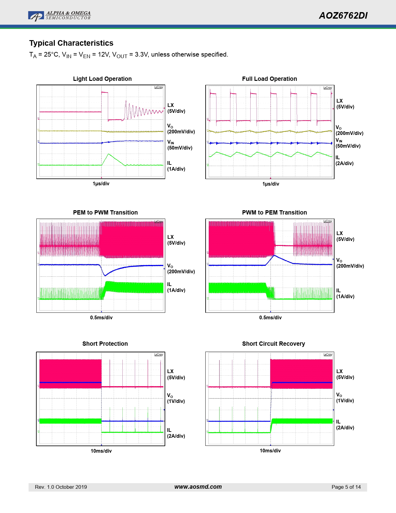 | Páginas / Página | 14 / 5 — AOZ6762DI. Typical Characteristics. Light Load Operation. Full Load … |