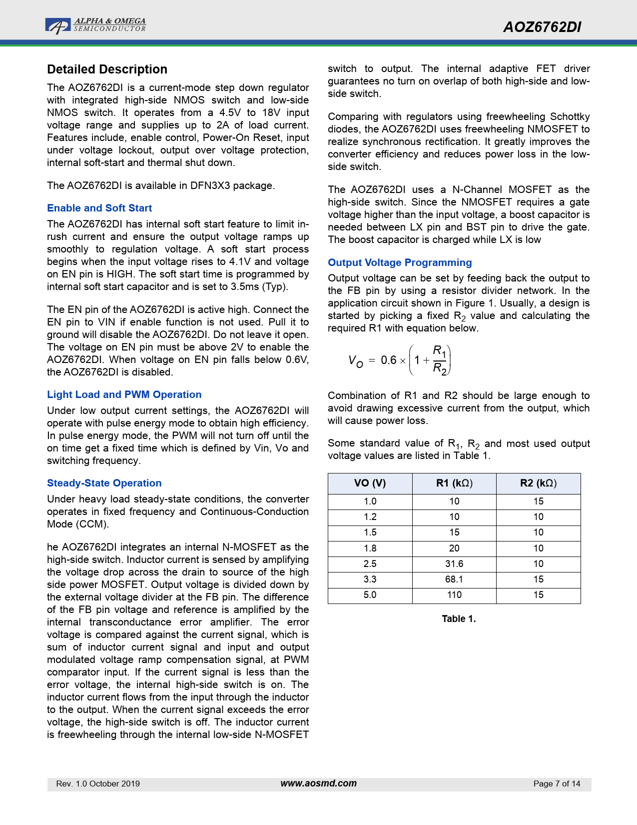 AOZ6762DI. Detailed Description. Enable and Soft Start. Output Voltage Programming. Light Load and PWM Operation