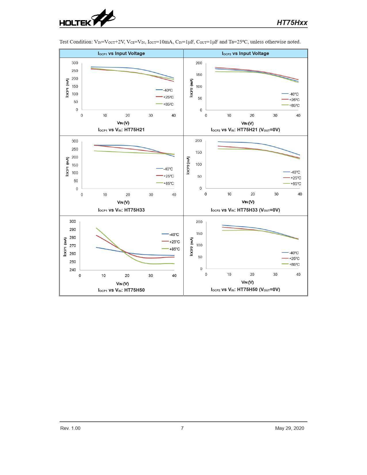 HT75Hxx Test Condition: VIN=VOUT+2V, VCE=VIN, IOUT=10mA, CIN=1μF, COUT=1μF and Ta=25ºC, unless otherwise noted. IOCP1 vs Input VoltageIOCP2 vs Input VoltageIOCP1 vs VIN: HT75H21IOCP2 vs VIN: HT75H21 (VOUT=0V)IOCP1 vs VIN: HT75H33IOCP2 vs VIN: HT75H33 (VOUT=0V)IOCP1 vs VIN: HT75H50IOCP2 vs VIN: HT75H50 (VOUT=0V) Rev. 1.00 7 May 29, 2020 Document Outline Features Applications General Description Selection Table Block Diagram Pin Assignment Pin Descriptions Absolute Maximum Ratings Recommended Operating Range Electrical Characteristics Typical Performance Characteristic Application Information Power-on Considerations OCP and OTP Protections Fast Output Discharging Function Input Capacitor CIN Consideration Output Capacitor COUT Considerations Thermal Considerations Power Dissipation Calculation Application Circuits Basic Circuits High Output Current Positive Voltage Regulator Short-Circuit Protection by Tr1 Increasing Output Voltage Circuits Constant Current Regulator Dual Supply Package Information 3-pin SOT89-3 Outline Dimensions 5-pin SOT23-5 Outline Dimensions 8-pin SOP-EP (150mil) Outline Dimensions