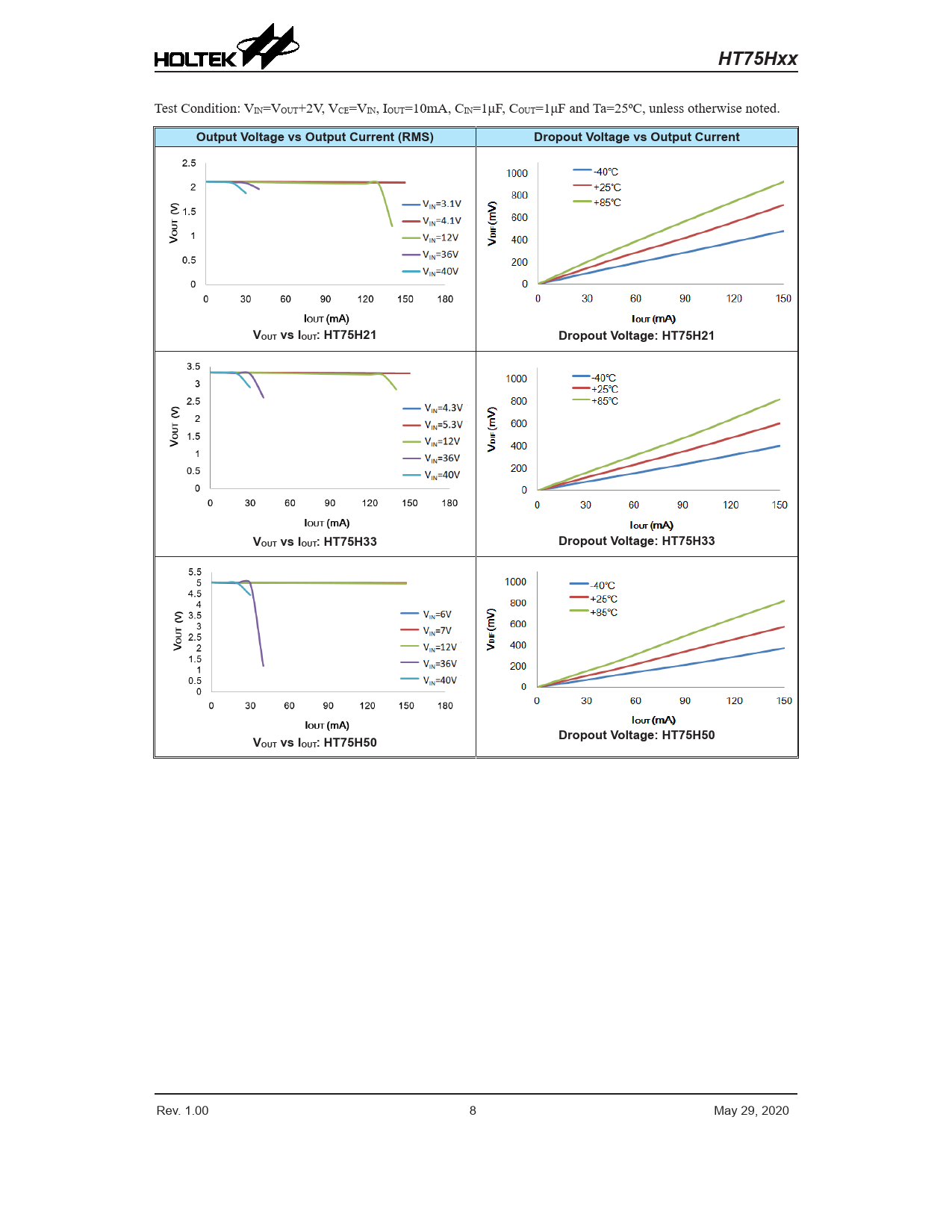 Output Voltage vs Output Current (RMS) Dropout Voltage vs Output Current VOUT vs IOUT: HT75H21 Dropout Voltage: HT75H21 VOUT vs IOUT: HT75H33 Dropout Voltage: HT75H33 VOUT vs IOUT: HT75H50 Dropout Voltage: HT75H50