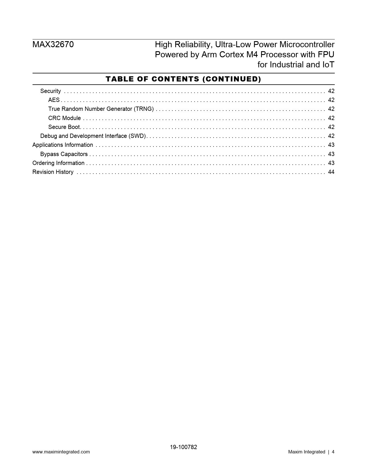 link to page 42 link to page 42 link to page 42 link to page 42 link to page 42 link to page 42 link to page 43 link to page 43 link to page 43 link to page 44 MAX32670 High Reliability, Ultra-Low Power Microcontroller Powered by Arm Cortex M4 Processor with FPU for Industrial and IoT TABLE OF CONTENTS (CONTINUED) Security . 42 AES . 42 True Random Number Generator (TRNG) . 42 CRC Module . 42 Secure Boot . 42 Debug and Development Interface (SWD) . 42 Applications Information . 43 Bypass Capacitors . 43 Ordering Information . 43 Revision History . 44 19-100782 www.maximintegrated.com Maxim Integrated | 4 Document Outline General Description Applications Benefits and Features Simplified Block Diagram Absolute Maximum Ratings Package Information 40 TQFN-EP Electrical Characteristics Electrical Characteristics (continued) Electrical Characteristics—SPI Electrical Characteristics—SPI (continued) Electrical Characteristics—I2C Electrical Characteristics—I2C (continued) Electrical Characteristics—I2S Slave Pin Configuration 40 TQFN Pin Description 40 TQFN Detailed Description MAX32670 Arm Cortex-M4 Processor with FPU Engine Memory Internal Flash Memory Internal SRAM Clocking Scheme General-Purpose I/O and Special Function Pins Standard DMA Controller Power Management Power Management Unit Active Mode Sleep Mode DeepSleep Mode Backup Mode Storage Mode Real-Time Clock Windowed Watchdog Timer (WWDT) 32-Bit Timer/Counter/PWM (TMR, LPTMR) Serial Peripherals I2C Interface (I2C) Serial Peripheral Interface (SPI) I2S Interface (I2S) UART (UART, LPUART) Security AES True Random Number Generator (TRNG) CRC Module Secure Boot Debug and Development Interface (SWD) Applications Information Bypass Capacitors Ordering Information Revision History