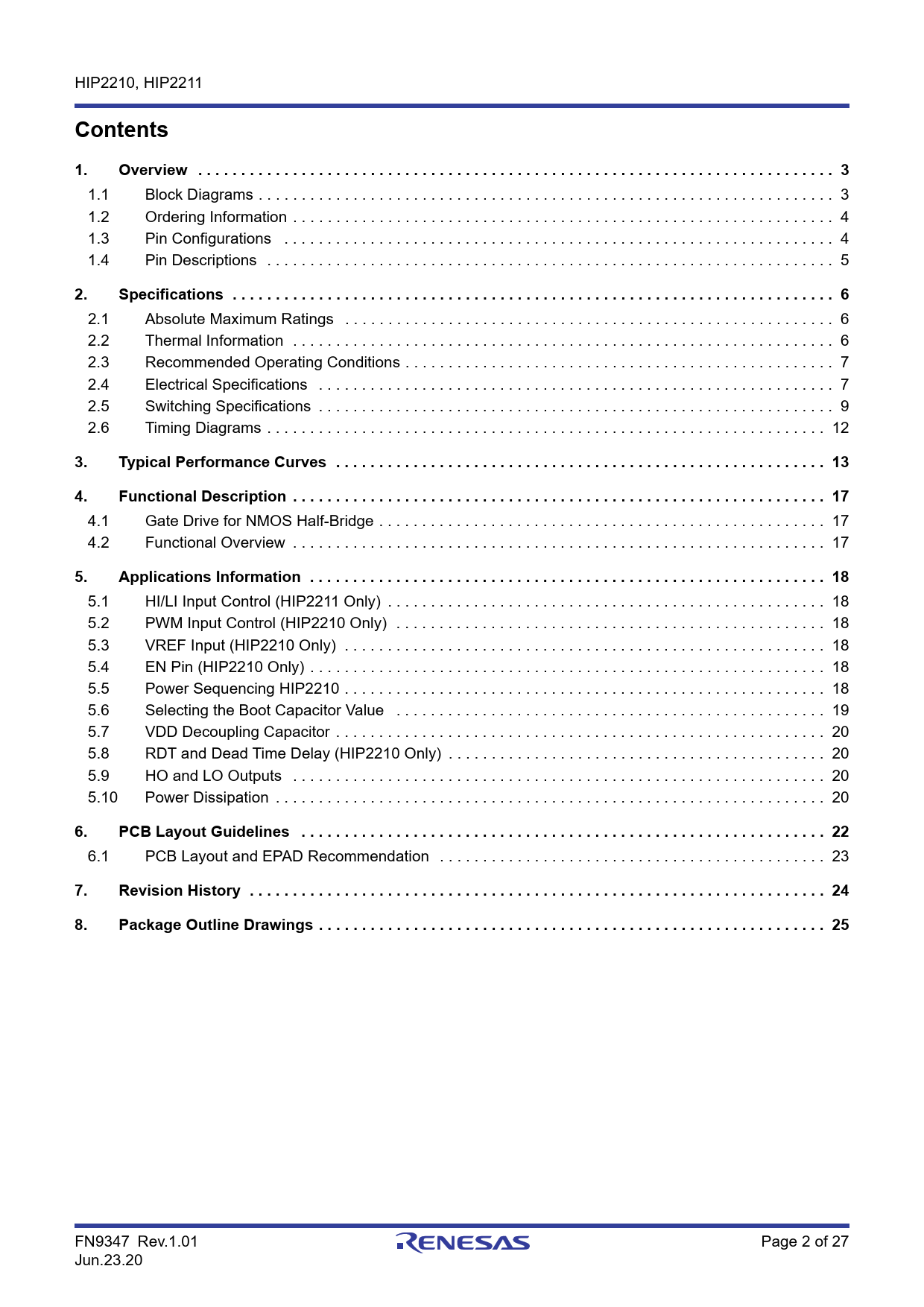 link to page 3 link to page 3 link to page 4 link to page 4 link to page 5 link to page 6 link to page 6 link to page 6 link to page 7 link to page 7 link to page 9 link to page 12 link to page 13 link to page 17 link to page 17 link to page 17 link to page 18 link to page 18 link to page 18 link to page 18 link to page 18 link to page 18 link to page 19 link to page 20 link to page 20 link to page 20 link to page 20 link to page 22 link to page 23 link to page 24 link to page 25 HIP2210, HIP2211 Contents1.Overview . 3 1.1 Block Diagrams . 3 1.2 Ordering Information . 4 1.3 Pin Configurations . 4 1.4 Pin Descriptions . 5 2.Specifications . 6 2.1 Absolute Maximum Ratings . 6 2.2 Thermal Information . 6 2.3 Recommended Operating Conditions . 7 2.4 Electrical Specifications . 7 2.5 Switching Specifications . 9 2.6 Timing Diagrams . 12 3.Typical Performance Curves . 134.Functional Description . 17 4.1 Gate Drive for NMOS Half-Bridge . 17 4.2 Functional Overview . 17 5.Applications Information . 18 5.1 HI/LI Input Control (HIP2211 Only) . 18 5.2 PWM Input Control (HIP2210 Only) . 18 5.3 VREF Input (HIP2210 Only) . 18 5.4 EN Pin (HIP2210 Only) . 18 5.5 Power Sequencing HIP2210 . 18 5.6 Selecting the Boot Capacitor Value . 19 5.7 VDD Decoupling Capacitor . 20 5.8 RDT and Dead Time Delay (HIP2210 Only) . 20 5.9 HO and LO Outputs . 20 5.10 Power Dissipation . 20 6.PCB Layout Guidelines . 22 6.1 PCB Layout and EPAD Recommendation . 23 7.Revision History . 248.Package Outline Drawings . 25 FN9347 Rev.1.01 Page 2 of 27 Jun.23.20 Document Outline Related Literature Features Applications Contents 1. Overview 1.1 Block Diagrams 1.2 Ordering Information 1.3 Pin Configurations 1.4 Pin Descriptions 2. Specifications 2.1 Absolute Maximum Ratings 2.2 Thermal Information 2.3 Recommended Operating Conditions 2.4 Electrical Specifications 2.5 Switching Specifications 2.6 Timing Diagrams 3. Typical Performance Curves 4. Functional Description 4.1 Gate Drive for NMOS Half-Bridge 4.2 Functional Overview 5. Applications Information 5.1 HI/LI Input Control (HIP2211 Only) 5.2 PWM Input Control (HIP2210 Only) 5.3 VREF Input (HIP2210 Only) 5.4 EN Pin (HIP2210 Only) 5.5 Power Sequencing HIP2210 5.6 Selecting the Boot Capacitor Value 5.7 VDD Decoupling Capacitor 5.8 RDT and Dead Time Delay (HIP2210 Only) 5.9 HO and LO Outputs 5.10 Power Dissipation 5.10.1 Gate Power (for the HO and LO Outputs) 5.10.2 Boot Diode Dissipation 5.10.3 Dynamic Operating Current 5.10.4 Total Power Dissipation 5.10.5 Junction Operating Temperature 6. PCB Layout Guidelines 6.1 PCB Layout and EPAD Recommendation 7. Revision History 8. Package Outline Drawings
