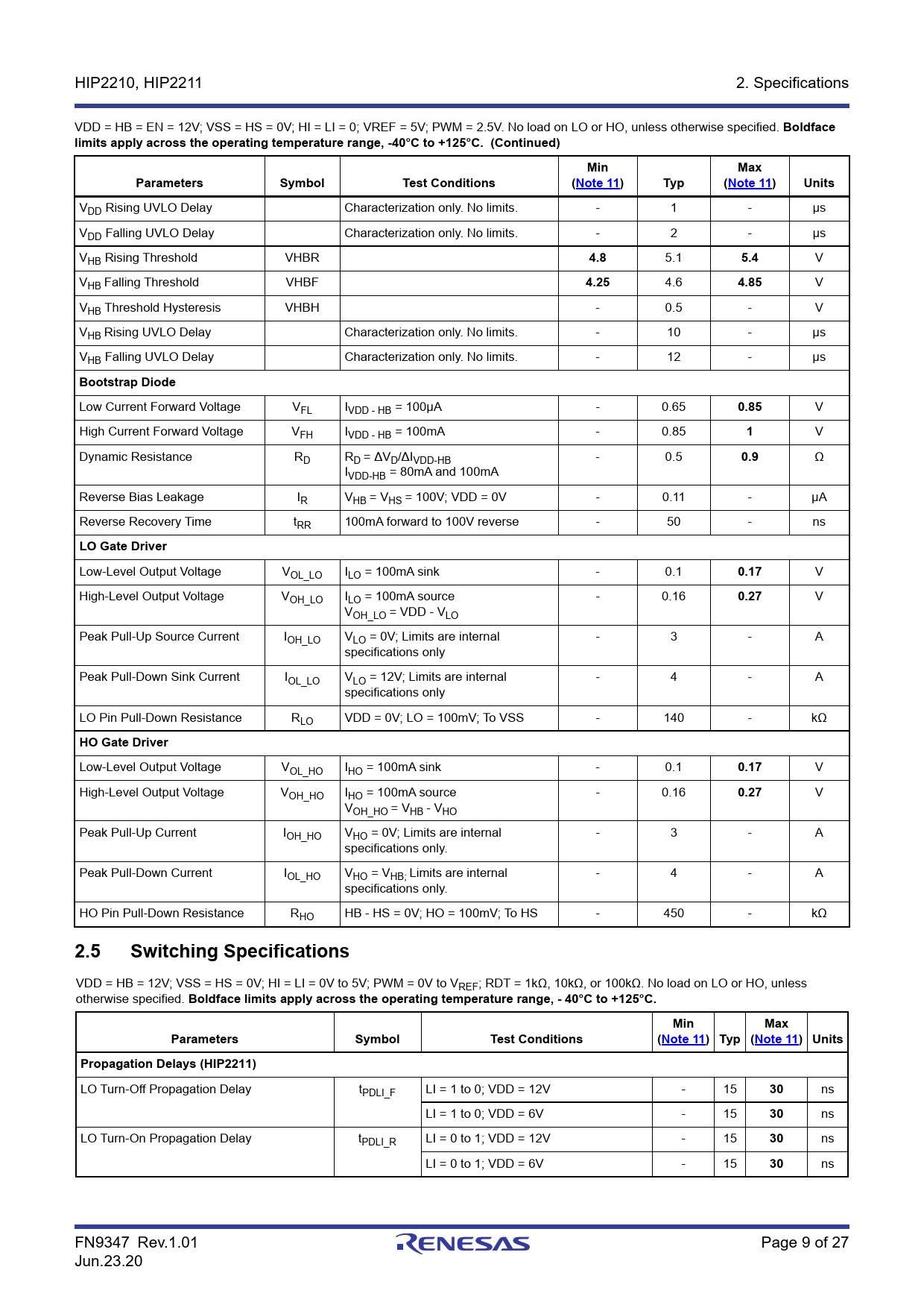 link to page 11 link to page 11 HIP2210, HIP2211 2. Specifications VDD = HB = EN = 12V; VSS = HS = 0V; HI = LI = 0; VREF = 5V; PWM = 2.5V. No load on LO or HO, unless otherwise specified.