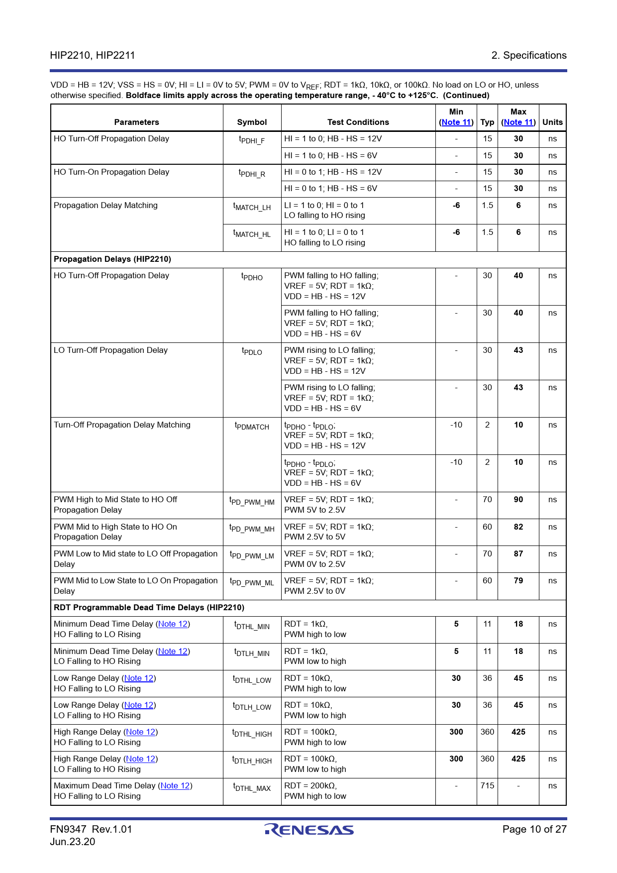 link to page 11 link to page 11 link to page 11 link to page 11 link to page 11 link to page 11 link to page 11 HIP2210, HIP2211 2. Specifications VDD = HB = 12V; VSS = HS = 0V; HI = LI = 0V to 5V; PWM = 0V to VREF; RDT = 1kΩ, 10kΩ, or 100kΩ. No load on LO or HO, unless otherwise specified.