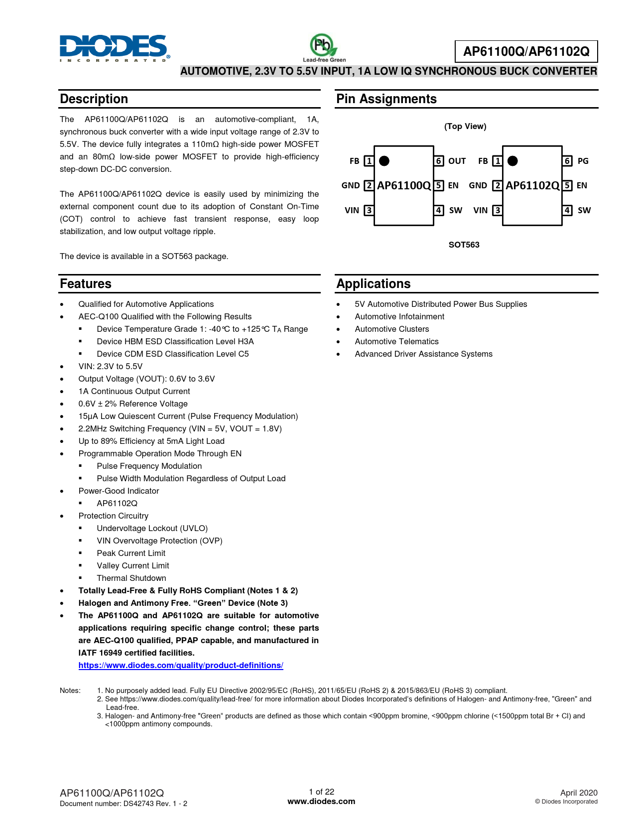 Totally Lead-Free & Fully RoHS Compliant (Notes 1 & 2) Halogen and Antimony Free. “Green” Device (Note 3) The AP61100Q and AP61102Q are suitable for automotive applications requiring specific change control; these parts are AEC-Q100 qualified, PPAP capable, and manufactured in IATF 16949 certified facilities. https://www.diodes.com/quality/product-definitions/