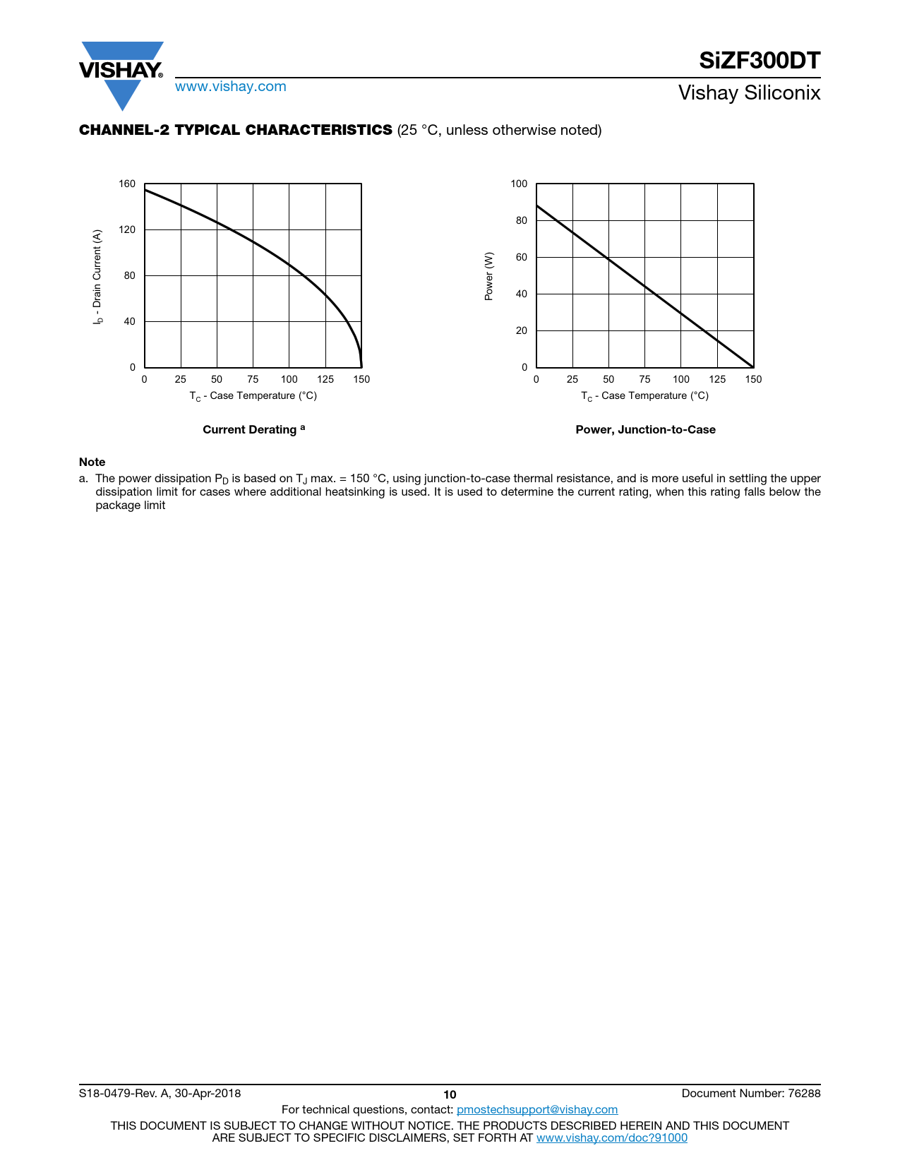 a. The power dissipation PD is based on TJ max. = 150 °C, using junction-to-case thermal resistance, and is more useful in settling the upper dissipation limit for cases where additional heatsinking is used. It is used to determine the current rating, when this rating falls below the package limit S18-0479-Rev. A, 30-Apr-2018