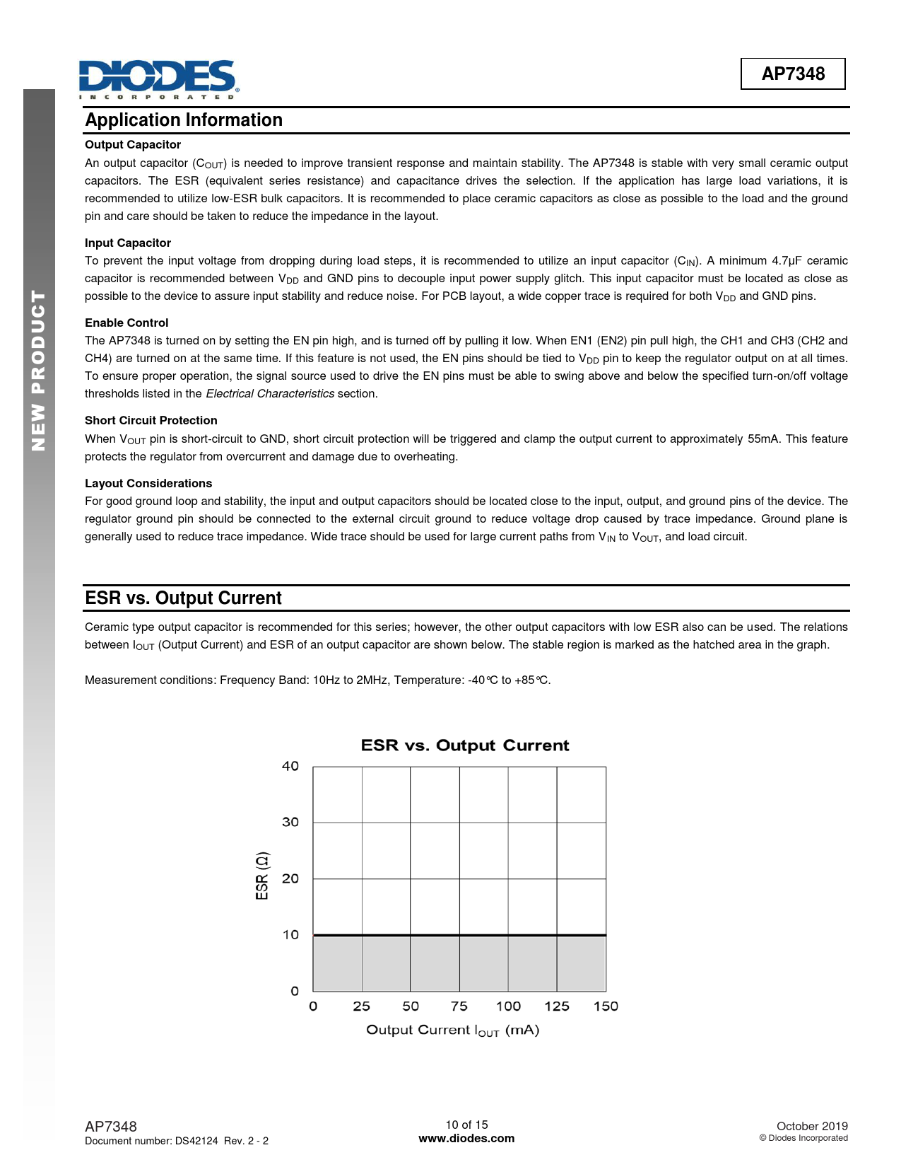 Ceramic type output capacitor is recommended for this series; however, the other output capacitors with low ESR also can be used. The relations between IOUT (Output Current) and ESR of an output capacitor are shown below. The stable region is marked as the hatched area in the graph. Measurement conditions: Frequency Band: 10Hz to 2MHz, Temperature: -40°C to +85°C. AP7348 10 of 15 October 2019 Document number: DS42124 Rev. 2 - 2