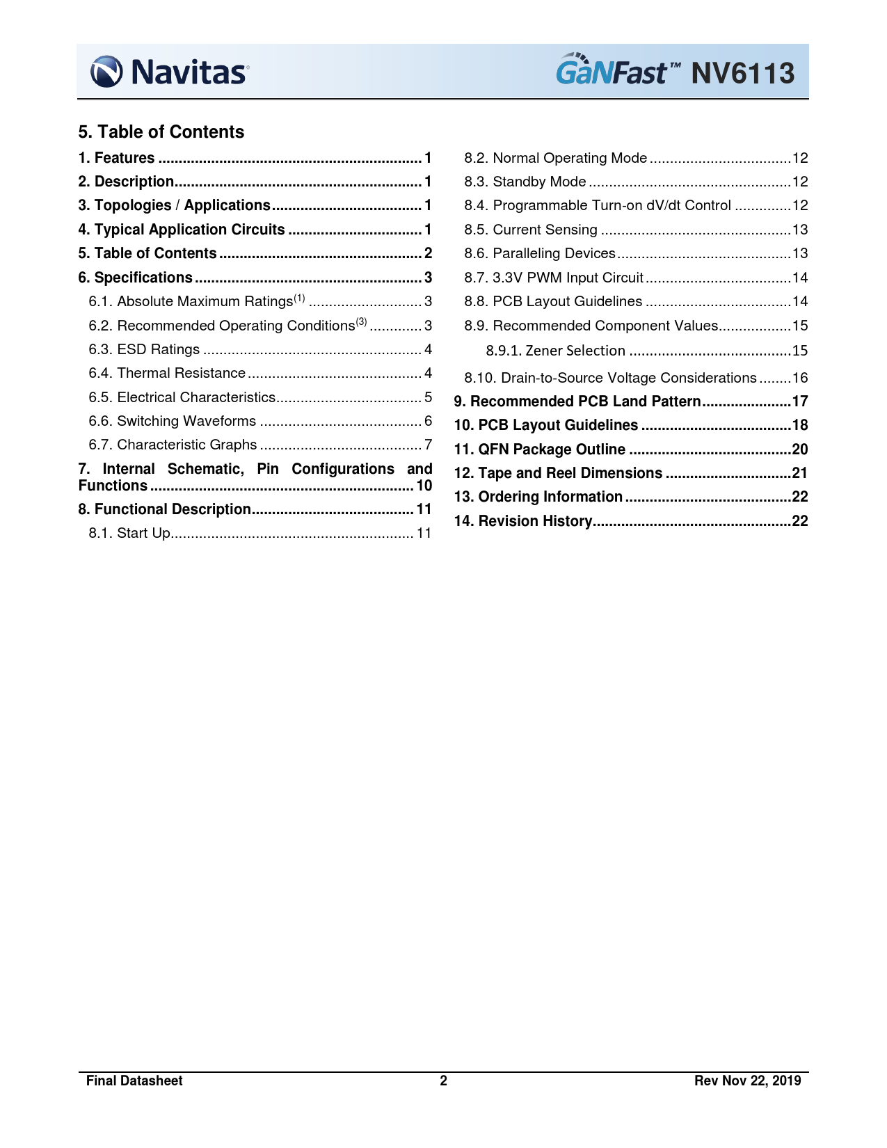 NV6113. 5. Table of Contents. 1. Features ... 1. 2. Description ... 1. 3. Topologies / Applications ... 1
