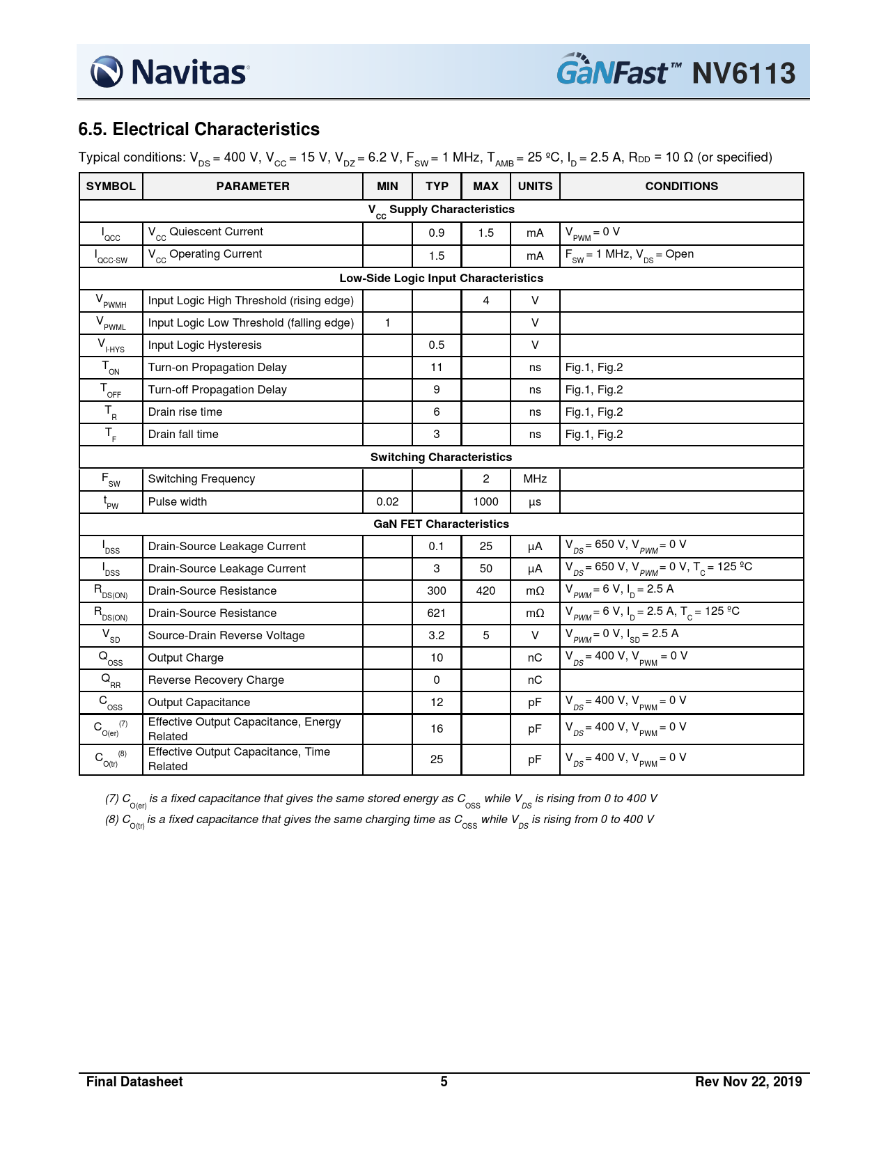 NV61136.5. Electrical Characteristics Typical conditions: V = 400 V, V = 15 V, V = 6.2 V, F = 1 MHz, T = 25 ºC, I = 2.5 A, RDD = 10 Ω (or specified) DS CC DZ SW AMB D SYMBOLPARAMETERMINTYPMAX UNITSCONDITIONSV Supply CharacteristicsCC I V Quiescent Current 0.9 1.5 mA V = 0 V QCC CC PWM I V Operating Current 1.5 mA F = 1 MHz, V = Open QCC-SW CC SW DS Low-Side Logic Input Characteristics V Input Logic High Threshold (rising edge) 4 V PWMH V Input Logic Low Threshold (falling edge) 1 V PWML V Input Logic Hysteresis 0.5 V I-HYS T Turn-on Propagation Delay 11 ns Fig.1, Fig.2 ON T Turn-off Propagation Delay 9 ns Fig.1, Fig.2 OFF T Drain rise time 6 ns Fig.1, Fig.2 R T Drain fall time 3 ns Fig.1, Fig.2 F Switching Characteristics F Switching Frequency 2 MHz SW t Pulse width 0.02 1000 µs PW GaN FET Characteristics I Drain-Source Leakage Current 0.1 25 µA V = 650 V, V = 0 V DSS DS PWM I Drain-Source Leakage Current 3 50 µA V = 650 V, V = 0 V, T = 125 ºC DSS DS PWM C R Drain-Source Resistance 300 420 mΩ V = 6 V, I = 2.5 A DS(ON) PWM D R Drain-Source Resistance 621 mΩ V = 6 V, I = 2.5 A, T = 125 ºC DS(ON) PWM D C V Source-Drain Reverse Voltage 3.2 5 V V = 0 V, I = 2.5 A SD PWM SD Q Output Charge 10 nC V = 400 V, V = 0 V OSS DS PWM Q Reverse Recovery Charge 0 nC RR C Output Capacitance 12 pF V = 400 V, V = 0 V OSS DS PWM C (7) Effective Output Capacitance, Energy 16 pF V = 400 V, V = 0 V O(er) Related DS PWM C (8) Effective Output Capacitance, Time 25 pF V = 400 V, V = 0 V O(tr) Related DS PWM (7) C is a fixed capacitance that gives the same stored energy as C while V is rising from 0 to 400 V O(er) OSS DS (8) C is a fixed capacitance that gives the same charging time as C while V is rising from 0 to 400 V O(tr) OSS DS Final Datasheet5Rev Nov 22, 2019