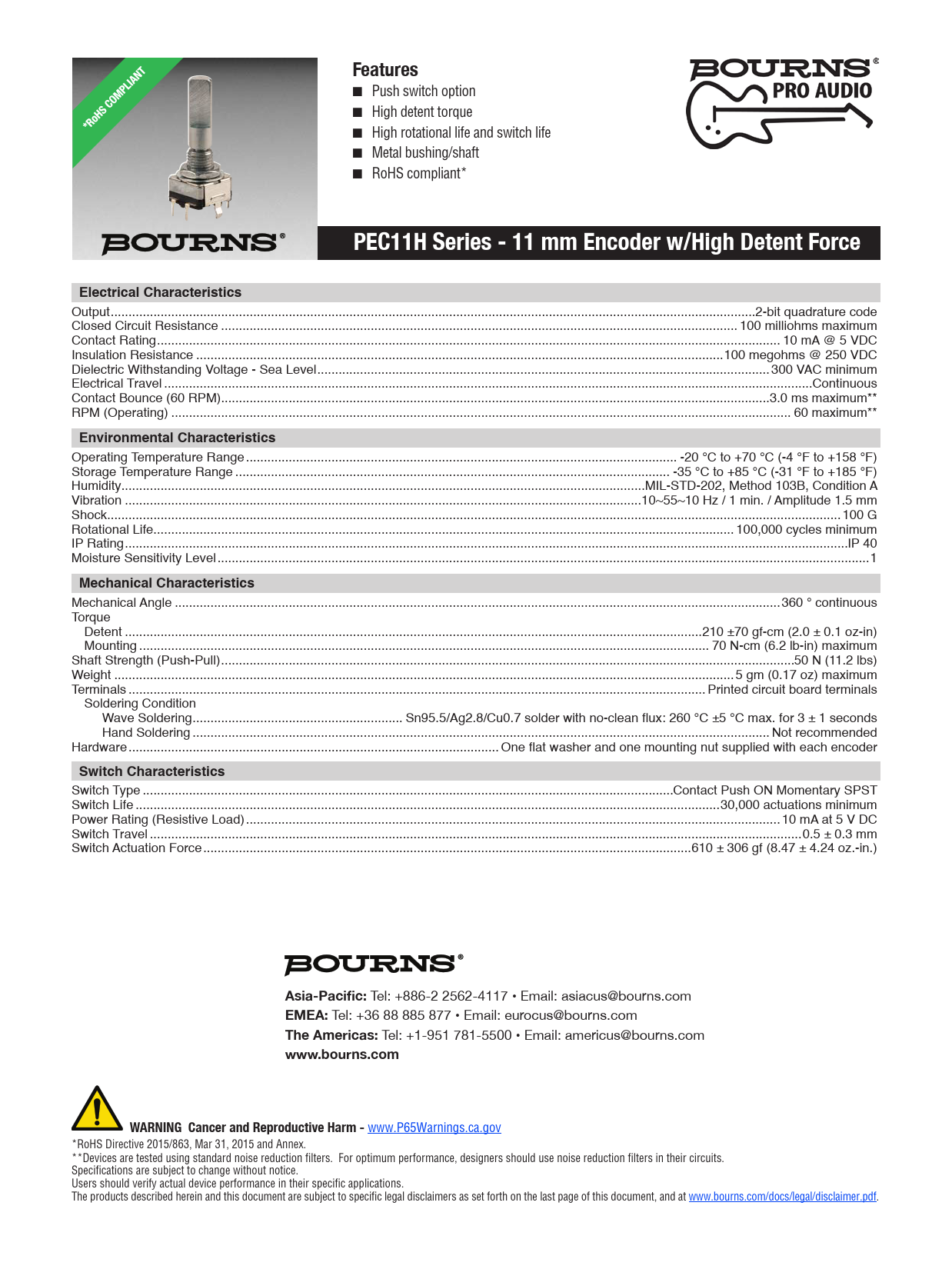 Features. PEC11H Series - 11 mm Encoder w/High Detent Force. Electrical Characteristics. Environmental Characteristics