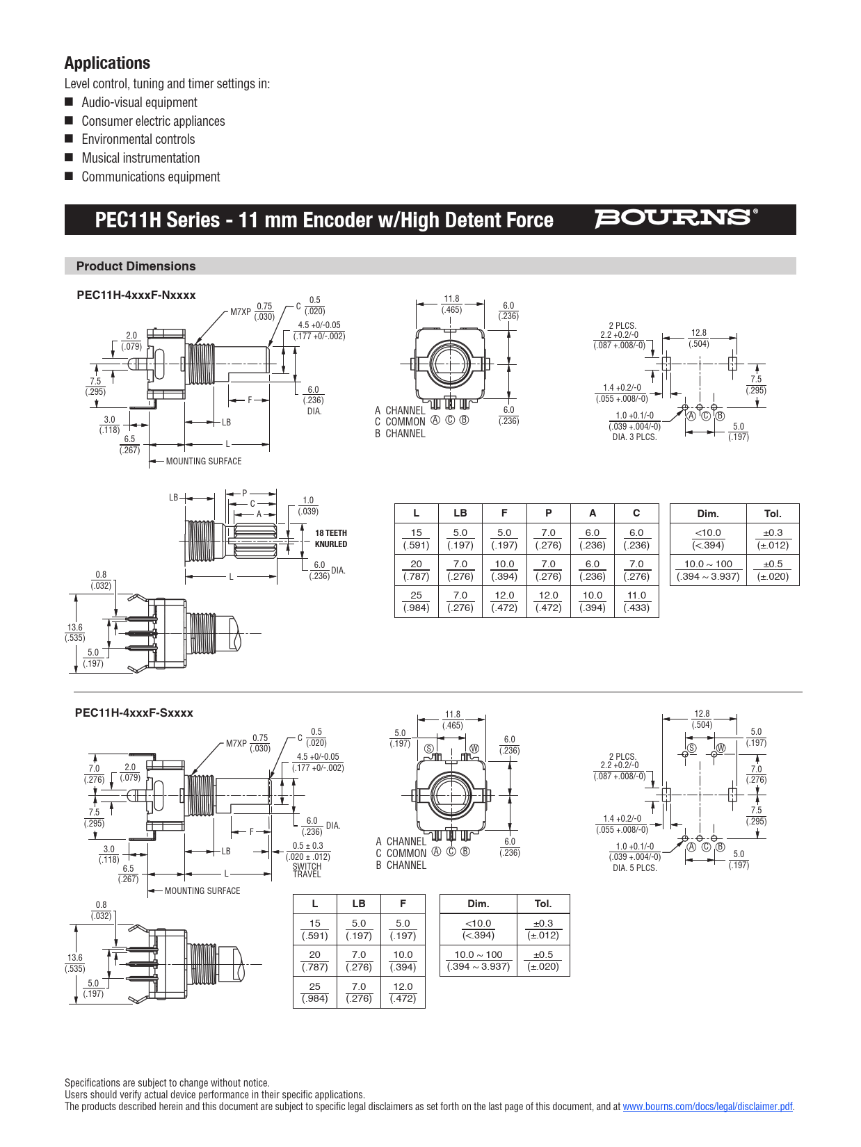 Applications. PEC11H Series - 11 mm Encoder w/High Detent Force. Product Dimensions. PEC11H-4xxxF-Nxxxx. Dim. Tol. 18 TEETH. KNURLED