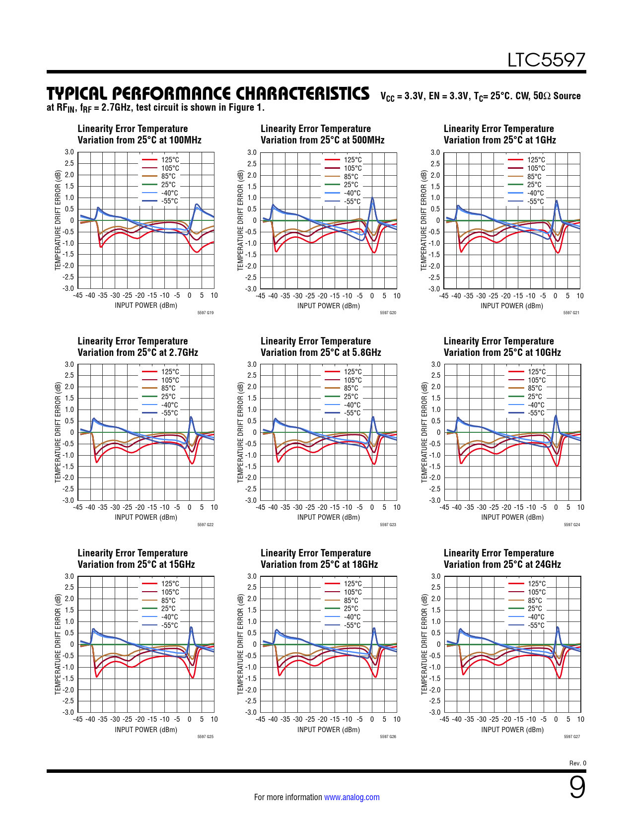 3.0 3.0 3.0 2.5 125°C 125°C 125°C 105°C 2.5 2.5 105°C 105°C 2.0 85°C 2.0 85°C 2.0 85°C 1.5 25°C 1.5 25°C 1.5 25°C -40°C 1.0 -40°C -40°C -55°C 1.0 -55°C 1.0 -55°C T ERROR (dB) 0.5 T ERROR (dB) 0.5 T ERROR (dB) 0.5 0 0 0 -0.5 -0.5 -0.5 TURE DRIF -1.0 TURE DRIF -1.0 TURE DRIF -1.0 -1.5 -1.5 -1.5 -2.0 TEMPERA -2.0 TEMPERA -2.0 TEMPERA -2.5 -2.5 -2.5 -3.0 -3.0 -3.0 -45 -40 -35 -30 -25 -20 -15 -10 -5 0 5 10 -45 -40 -35 -30 -25 -20 -15 -10 -5 0 5 10 -45 -40 -35 -30 -25 -20 -15 -10 -5 0 5 10 INPUT POWER (dBm) INPUT POWER (dBm) INPUT POWER (dBm) 5597 G19 5597 G20 5597 G21