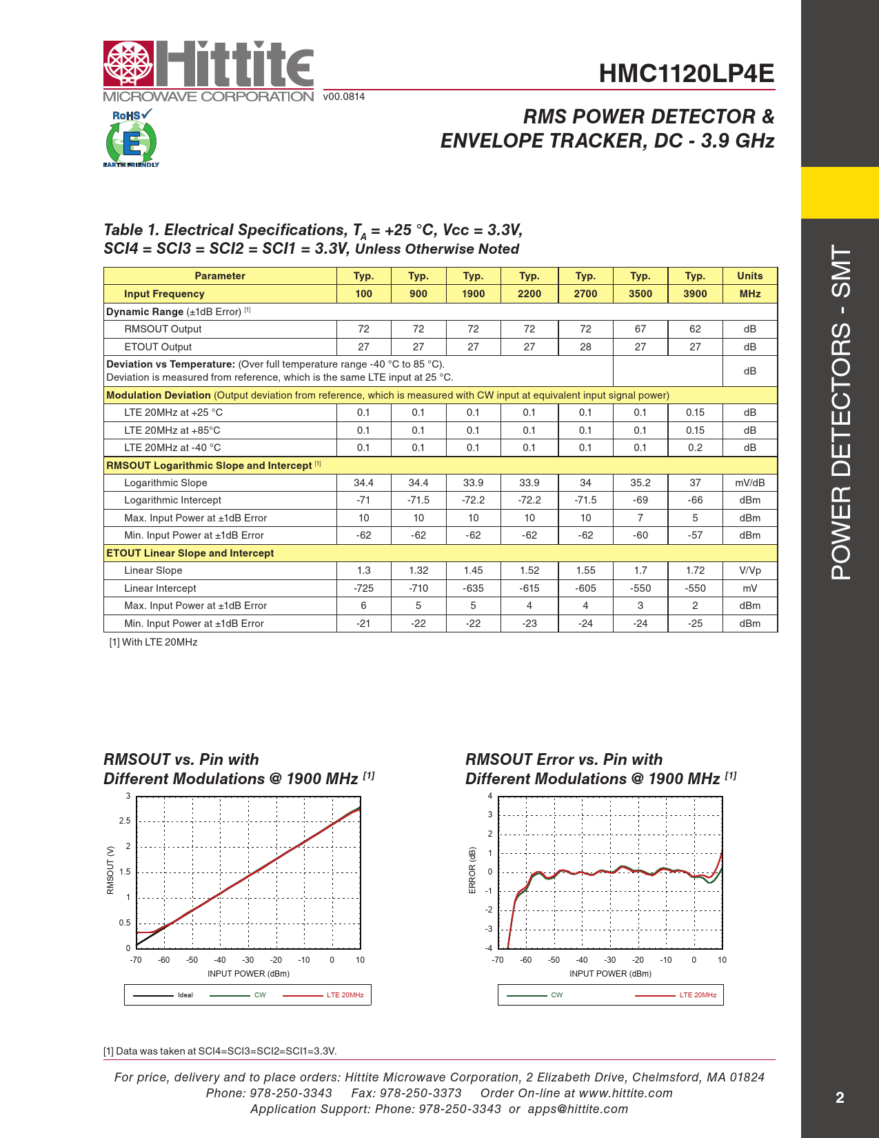 HMC1120LP4E v00.0814 RMS POWER DETECTOR &ENVELOPE TRACKER, DC - 3.9 GHzTable 1. Electrical Specifications, T = +25 °C, Vcc = 3.3V,ASCi4 = SCi3 = SCi2 = SCi1 = 3.3V, Unless Otherwise Noted T ParameterTyp.Typ.Typ.Typ.Typ.Typ.Typ.Units M Input Frequency10090019002200270035003900MHz S Dynamic Range (±1dB Error) [1] - RMSOUT Output 72 72 72 72 72 67 62 dB ETOUT Output 27 27 27 27 28 27 27 dB RS Deviation vs Temperature: (Over full temperature range -40 °C to 85 °C). dB Deviation is measured from reference, which is the same LTE input at 25 °C. O T Modulation Deviation (Output deviation from reference, which is measured with CW input at equivalent input signal power) LTE 20MHz at +25 °C 0.1 0.1 0.1 0.1 0.1 0.1 0.15 dB C E LTE 20MHz at +85°C 0.1 0.1 0.1 0.1 0.1 0.1 0.15 dB T LTE 20MHz at -40 °C 0.1 0.1 0.1 0.1 0.1 0.1 0.2 dB E RMSOUT Logarithmic Slope and Intercept [1] Logarithmic Slope 34.4 34.4 33.9 33.9 34 35.2 37 mV/dB D Logarithmic Intercept -71 -71.5 -72.2 -72.2 -71.5 -69 -66 dBm R Max. Input Power at ±1dB Error 10 10 10 10 10 7 5 dBm E Min. Input Power at ±1dB Error -62 -62 -62 -62 -62 -60 -57 dBm W ETOUT Linear Slope and Intercept O Linear Slope 1.3 1.32 1.45 1.52 1.55 1.7 1.72 V/Vp P Linear Intercept -725 -710 -635 -615 -605 -550 -550 mV Max. Input Power at ±1dB Error 6 5 5 4 4 3 2 dBm Min. Input Power at ±1dB Error -21 -22 -22 -23 -24 -24 -25 dBm [1] With LTE 20MHz RMSOUT vs. Pin withRMSOUT Error vs. Pin withDifferent Modulations @ 1900 MHz [1]Different Modulations @ 1900 MHz [1] 3 4 3 2.5 2 2 1 1.5 0 RMSOUT (V) ERROR (dB) -1 1 -2 0.5 -3 0 -4 -70 -60 -50 -40 -30 -20 -10 0 10 -70 -60 -50 -40 -30 -20 -10 0 10 INPUT POWER (dBm) INPUT POWER (dBm) Ideal CW LTE 20MHz CW LTE 20MHz [1] Data was taken at SCI4=SCI3=SCI2=SCI1=3.3V. For price, delivery and to place orders: Hittite Microwave Corporation, 2 Elizabeth Drive, Chelmsford, MA 01824 Phone: 978-250-3343 Fax: 978-250-3373 Order On-line at www.hittite.com 2 Application Support: Phone: 978-250-3343 or apps@hittite.com Document Outline Typical Applications Features Functional Diagram General Description Typical Performance Characteristics Electrical Specifications RMSOUT Error vs. Pin with Different Modulations @ 1900 MHz RMSOUT & Error vs. Pin @ 500 MHz RMSOUT & Error vs. Pin @ 900 MHz RMSOUT & Error vs. Pin @ 1900 MHz RMSOUT & Error vs. Pin @ 2200 MHz RMSOUT & Error vs. Pin @ 2700 MHz RMSOUT & Error vs. Pin @ 3500 MHz RMSOUT Intercept vs. Frequency RMSOUT Slope vs. Frequency RMSOUT vs. Pin with WCDMA 4 Carrier @ +25 °C RMSOUT Error vs. Pin with WCDMA 4 Carrier @ +25 °C RMSOUT Error vs. Pin with WCDMA 4 Carrier @ +85 °C wrt +25 °C Response RMSOUT vs. Pin with CW @ +25 °C RMSOUT Error vs. Pin with CW @ +25 °C RMSOUT vs. Pin w/ CW & WCDMA 4 Carrier @ 1900 MHz & +25 °C Reading Error for WCDMA 4 Carrier wrt CW Response @ +25 °C RMSOUT vs. Pin w/ CW & WCDMA 4 Carrier @ 1900 MHz & +85 °C Reading Error for WCDMA 4 Carrier wrt CW Response @ +85 °C RMSOUT vs. Pin w/ CW & WCDMA 4 Carrier @ 1900 MHz & -40 °C Reading Error for WCDMA 4 Carrier wrt CW Response @ -40 °C RMSOUT Output Response with SCI = 0000 @ 1900 MHz RMSOUT Output Response with SCI = 1100 @ 1900 MHz Typical Supply Current vs. Pin, Vcc = 3.3V Input Return Loss vs. Frequency Output Ripple & Rise/Fall Time vs. Integration Setting [Sci4,Sci3,Sci2,Sci1] in Decimal ETOUT vs. Vin with CW @ 900 MHz ETOUT & ETOUT Error vs. Pin with CW @ 900 MHz ETOUT vs. Vin with CW @ 1900 MHz ETOUT & ETOUT Error vs. Pin with CW @ 1900 MHz ETOUT vs. Pin with CW @ 2200 MHz ETOUT & ETOUT Error vs. Pin with CW @ 2200 MHz ETOUT vs. Pin with CW @ 2700 MHz ETOUT & ETOUT Error vs. Pin with CW @ 2700 MHz ETOUT vs. Pin with CW @ 3500 MHz ETOUT & ETOUT Error vs. Pin with CW @ 3500 MHz ETOUT & ETOUT Error vs. Pin with CW @ 3900 MHz ETOUT vs. Pin with CW @ 3900 MHz ETOUT Intercept vs. Frequency with CW ETOUT Slope vs. Frequency with CW Absolute Maximum Ratings Outline Drawing Package Information Pin Descriptions Evaluation PCB Evaluation Order Information List of Materials for Evaluation PCB Application Circuit Application Information Principle of Operation Configuration For The Typical Application Broadband Single-Ended Input Interface Envelope Detector Output RMS Output Interface and Transient Response LOG-Slope and Intercept DC Offset Compensation Loop Standby Mode Modulation Performance - Crest factor performance System Calibration Layout Considerations Definitions