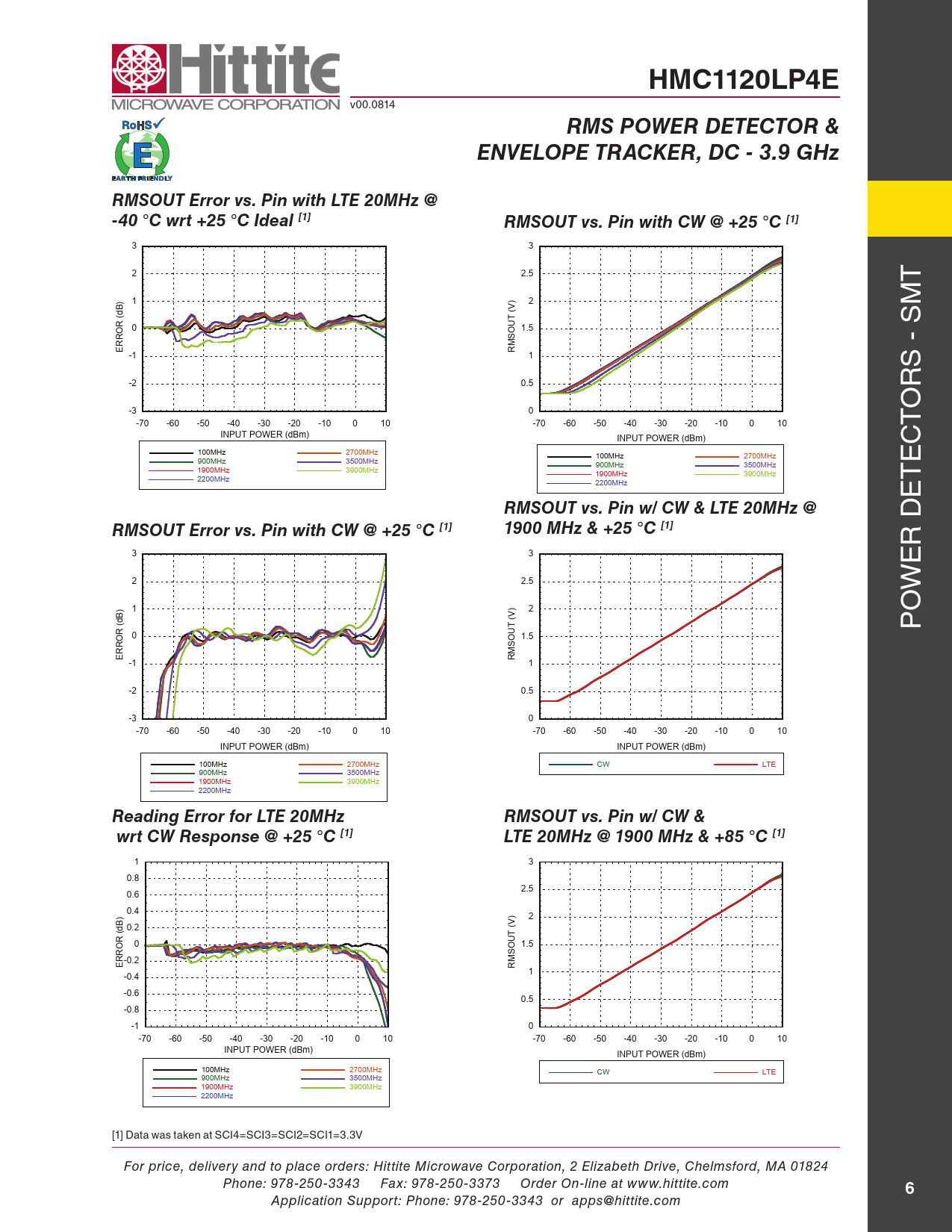 Application Support: Phone: 978-250-3343 or apps@hittite.com Document Outline Typical Applications Features Functional Diagram General Description Typical Performance Characteristics Electrical Specifications RMSOUT Error vs. Pin with Different Modulations @ 1900 MHz RMSOUT & Error vs. Pin @ 500 MHz RMSOUT & Error vs. Pin @ 900 MHz RMSOUT & Error vs. Pin @ 1900 MHz RMSOUT & Error vs. Pin @ 2200 MHz RMSOUT & Error vs. Pin @ 2700 MHz RMSOUT & Error vs. Pin @ 3500 MHz RMSOUT Intercept vs. Frequency RMSOUT Slope vs. Frequency RMSOUT vs. Pin with WCDMA 4 Carrier @ +25 °C RMSOUT Error vs. Pin with WCDMA 4 Carrier @ +25 °C RMSOUT Error vs. Pin with WCDMA 4 Carrier @ +85 °C wrt +25 °C Response RMSOUT vs. Pin with CW @ +25 °C RMSOUT Error vs. Pin with CW @ +25 °C RMSOUT vs. Pin w/ CW & WCDMA 4 Carrier @ 1900 MHz & +25 °C Reading Error for WCDMA 4 Carrier wrt CW Response @ +25 °C RMSOUT vs. Pin w/ CW & WCDMA 4 Carrier @ 1900 MHz & +85 °C Reading Error for WCDMA 4 Carrier wrt CW Response @ +85 °C RMSOUT vs. Pin w/ CW & WCDMA 4 Carrier @ 1900 MHz & -40 °C Reading Error for WCDMA 4 Carrier wrt CW Response @ -40 °C RMSOUT Output Response with SCI = 0000 @ 1900 MHz RMSOUT Output Response with SCI = 1100 @ 1900 MHz Typical Supply Current vs. Pin, Vcc = 3.3V Input Return Loss vs. Frequency Output Ripple & Rise/Fall Time vs. Integration Setting [Sci4,Sci3,Sci2,Sci1] in Decimal ETOUT vs. Vin with CW @ 900 MHz ETOUT & ETOUT Error vs. Pin with CW @ 900 MHz ETOUT vs. Vin with CW @ 1900 MHz ETOUT & ETOUT Error vs. Pin with CW @ 1900 MHz ETOUT vs. Pin with CW @ 2200 MHz ETOUT & ETOUT Error vs. Pin with CW @ 2200 MHz ETOUT vs. Pin with CW @ 2700 MHz ETOUT & ETOUT Error vs. Pin with CW @ 2700 MHz ETOUT vs. Pin with CW @ 3500 MHz ETOUT & ETOUT Error vs. Pin with CW @ 3500 MHz ETOUT & ETOUT Error vs. Pin with CW @ 3900 MHz ETOUT vs. Pin with CW @ 3900 MHz ETOUT Intercept vs. Frequency with CW ETOUT Slope vs. Frequency with CW Absolute Maximum Ratings Outline Drawing Package Information Pin Descriptions Evaluation PCB Evaluation Order Information List of Materials for Evaluation PCB Application Circuit Application Information Principle of Operation Configuration For The Typical Application Broadband Single-Ended Input Interface Envelope Detector Output RMS Output Interface and Transient Response LOG-Slope and Intercept DC Offset Compensation Loop Standby Mode Modulation Performance - Crest factor performance System Calibration Layout Considerations Definitions