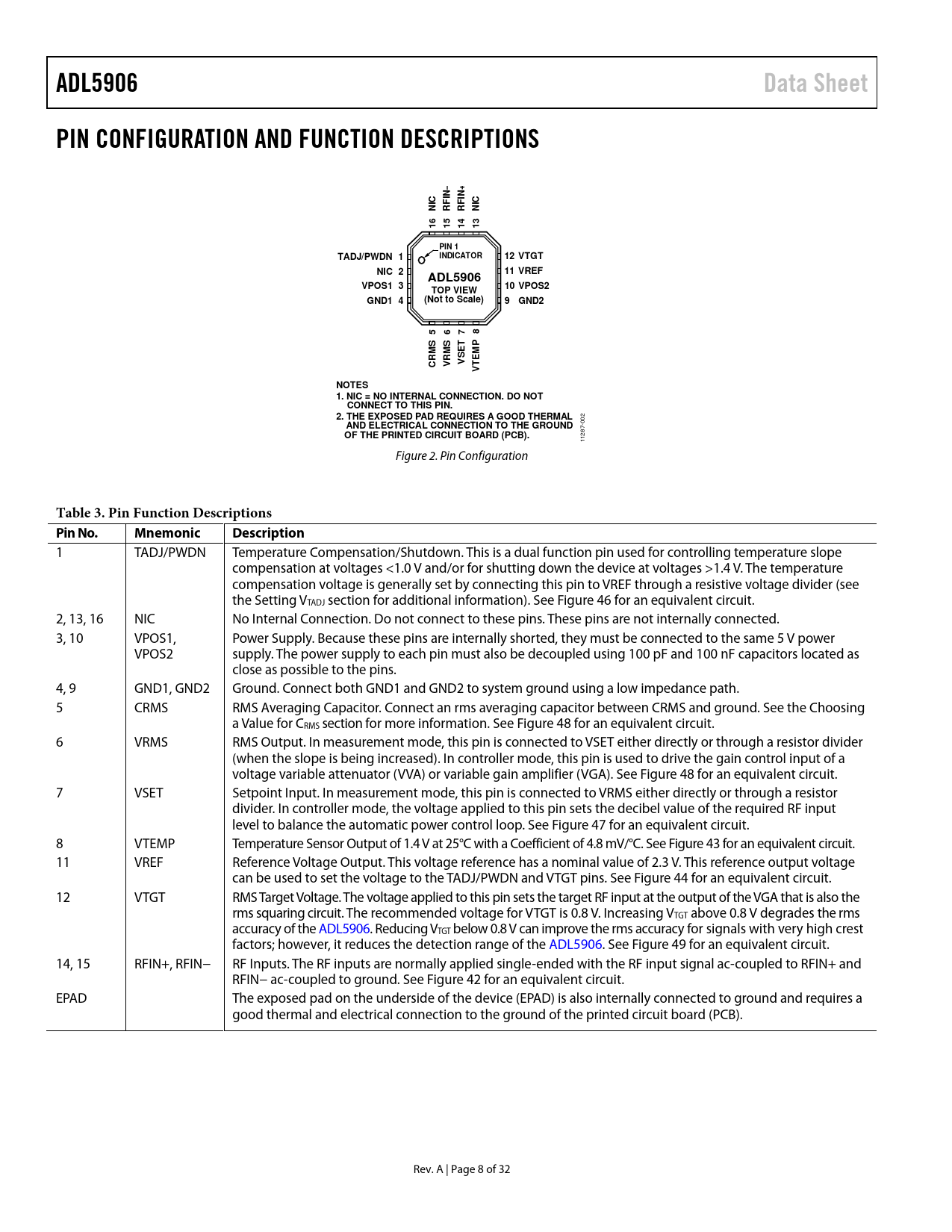 link to page 20 link to page 19 link to page 21 link to page 21 link to page 19 link to page 19 link to page 19 link to page 17 link to page 17 link to page 19 link to page 17 ADL5906Data SheetPIN CONFIGURATION AND FUNCTION DESCRIPTIONSN–IN+IICICNRFRFN65431111PIN 1TADJ/PWDN 1INDICATOR12 VTGTNIC 211 VREFADL5906VPOS1 310 VPOS2TOP VIEWGND1 4(Not to Scale)9GND25678SMSEMPCRMVRVSETT VNOTES 1. NIC = NO INTERNAL CONNECTION. DO NOT CONNECT TO THIS PIN. 2. THE EXPOSED PAD REQUIRES A GOOD THERMAL 002 AND ELECTRICAL CONNECTION TO THE GROUNDOF THE PRINTED CIRCUIT BOARD (PCB). 1287- 1 Figure 2. Pin Configuration Table 3. Pin Function Descriptions Pin No.MnemonicDescription 1 TADJ/PWDN Temperature Compensation/Shutdown. This is a dual function pin used for controlling temperature slope compensation at voltages <1.0 V and/or for shutting down the device at voltages >1.4 V. The temperature compensation voltage is generally set by connecting this pin to VREF through a resistive voltage divider (see the Setting VTADJ section for additional information). See Figure 46 for an equivalent circuit. 2, 13, 16 NIC No Internal Connection. Do not connect to these pins. These pins are not internally connected. 3, 10 VPOS1, Power Supply. Because these pins are internally shorted, they must be connected to the same 5 V power VPOS2 supply. The power supply to each pin must also be decoupled using 100 pF and 100 nF capacitors located as close as possible to the pins. 4, 9 GND1, GND2 Ground. Connect both GND1 and GND2 to system ground using a low impedance path. 5 CRMS RMS Averaging Capacitor. Connect an rms averaging capacitor between CRMS and ground. See the Choosing a Value for CRMS section for more information. See Figure 48 for an equivalent circuit. 6 VRMS RMS Output. In measurement mode, this pin is connected to VSET either directly or through a resistor divider (when the slope is being increased). In controller mode, this pin is used to drive the gain control input of a voltage variable attenuator (VVA) or variable gain amplifier (VGA). See Figure 48 for an equivalent circuit. 7 VSET Setpoint Input. In measurement mode, this pin is connected to VRMS either directly or through a resistor divider. In controller mode, the voltage applied to this pin sets the decibel value of the required RF input level to balance the automatic power control loop. See Figure 47 for an equivalent circuit. 8 VTEMP Temperature Sensor Output of 1.4 V at 25°C with a Coefficient of 4.8 mV/°C. See Figure 43 for an equivalent circuit. 11 VREF Reference Voltage Output. This voltage reference has a nominal value of 2.3 V. This reference output voltage can be used to set the voltage to the TADJ/PWDN and VTGT pins. See Figure 44 for an equivalent circuit. 12 VTGT RMS Target Voltage. The voltage applied to this pin sets the target RF input at the output of the VGA that is also the rms squaring circuit. The recommended voltage for VTGT is 0.8 V. Increasing VTGT above 0.8 V degrades the rms accuracy of the ADL5906. Reducing VTGT below 0.8 V can improve the rms accuracy for signals with very high crest factors; however, it reduces the detection range of the ADL5906. See Figure 49 for an equivalent circuit. 14, 15 RFIN+, RFIN− RF Inputs. The RF inputs are normally applied single-ended with the RF input signal ac-coupled to RFIN+ and RFIN− ac-coupled to ground. See Figure 42 for an equivalent circuit. EPAD The exposed pad on the underside of the device (EPAD) is also internally connected to ground and requires a good thermal and electrical connection to the ground of the printed circuit board (PCB). Rev. A | Page 8 of 32 Document Outline Features Applications Functional Block Diagram General Description Table of Contents Revision History Specifications Absolute Maximum Ratings ESD Caution Pin Configuration and Function Descriptions Typical Performance Characteristics Theory of Operation Square Law Detector and Amplitude Target RF Input Interface Temperature Sensor Interface VREF Interface Temperature Compensation Interface Power-Down Interface VSET Interface Output Interface VTGT Interface Basis for Error Calculations Measurement Mode Basic Connections Setting VTADJ Setting VTGT Choosing a Value for CRMS Output Voltage Scaling System Calibration and Error Calculation Using VTEMP to Improve Intercept Temperature Drift Description of Characterization Evaluation Board Evaluation Board Assembly Drawings Outline Dimensions Ordering Guide