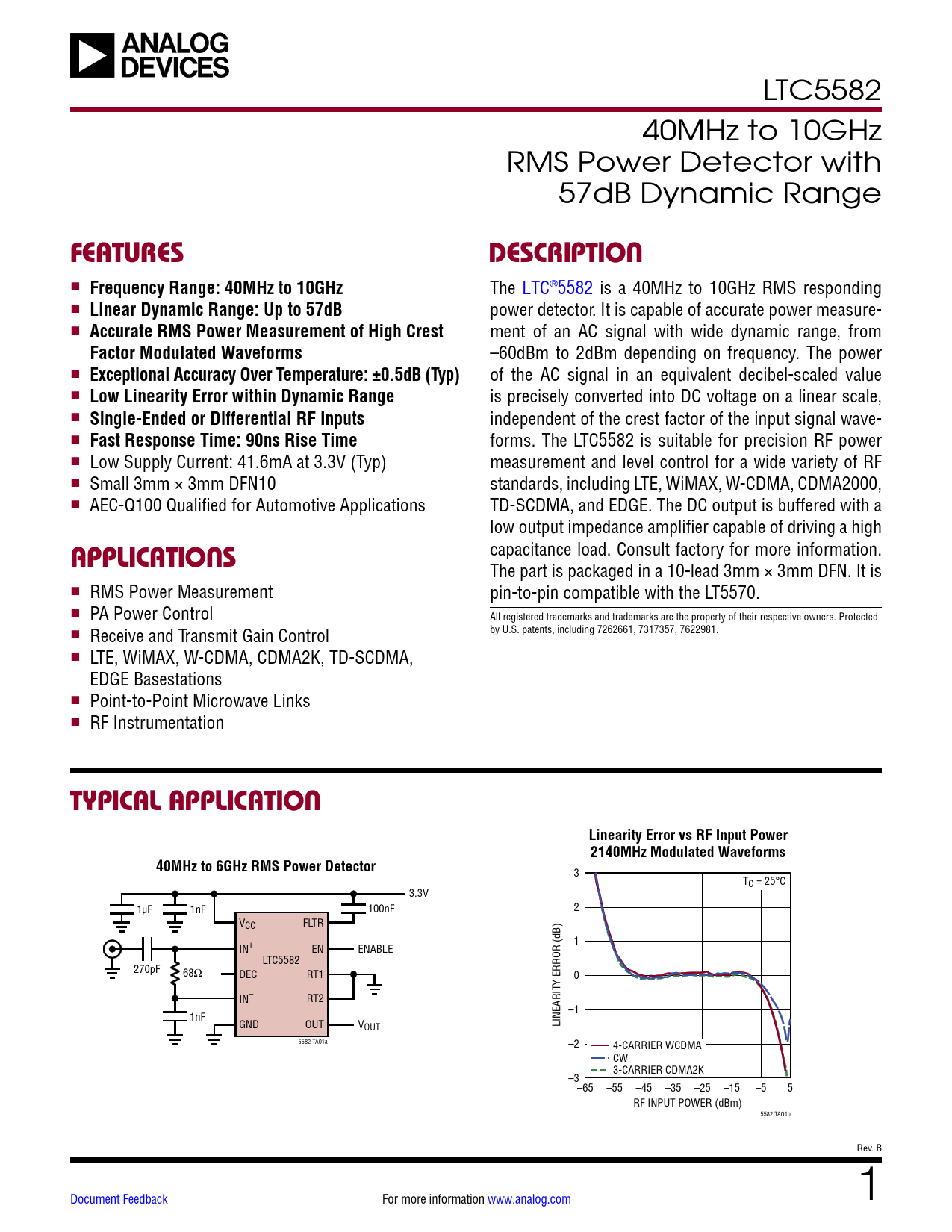 LTC5582 40MHz to 10GHz RMS Power Detector with 57dB Dynamic Range FEATURESDESCRIPTION n Frequency Range: 40MHz to 10GHz The LTC®5582 is a 40MHz to 10GHz RMS responding n Linear Dynamic Range: Up to 57dB power detector. It is capable of accurate power measure- n Accurate RMS Power Measurement of High Crest ment of an AC signal with wide dynamic range, from Factor Modulated Waveforms –60dBm to 2dBm depending on frequency. The power n Exceptional Accuracy Over Temperature: ±0.5dB (Typ) of the AC signal in an equivalent decibel-scaled value n Low Linearity Error within Dynamic Range is precisely converted into DC voltage on a linear scale, n Single-Ended or Differential RF Inputs independent of the crest factor of the input signal wave- n Fast Response Time: 90ns Rise Time forms. The LTC5582 is suitable for precision RF power n Low Supply Current: 41.6mA at 3.3V (Typ) measurement and level control for a wide variety of RF n Small 3mm × 3mm DFN10 standards, including LTE, WiMAX, W-CDMA, CDMA2000, n AEC-Q100 Qualified for Automotive Applications TD-SCDMA, and EDGE. The DC output is buffered with a low output impedance amplifier capable of driving a high capacitance load. Consult factory for more information. APPLICATIONS The part is packaged in a 10-lead 3mm × 3mm DFN. It is n RMS Power Measurement pin-to-pin compatible with the LT5570. n PA Power Control All registered trademarks and trademarks are the property of their respective owners. Protected by U.S. patents, including 7262661, 7317357, 7622981. n Receive and Transmit Gain Control n LTE, WiMAX, W-CDMA, CDMA2K, TD-SCDMA, EDGE Basestations n Point-to-Point Microwave Links n RF Instrumentation TYPICAL APPLICATIONLinearity Error vs RF Input Power2140MHz Modulated Waveforms40MHz to 6GHz RMS Power Detector 3 TC = 25°C 3.3V 1µF 1nF 100nF 2 VCC FLTR 1 IN+ EN ENABLE LTC5582 270pF 68Ω DEC RT1 Y ERROR (dB) 0 IN– RT2 –1 1nF GND OUT V LINEARIT OUT 5582 TA01a –2 4-CARRIER WCDMA CW 3-CARRIER CDMA2K –3–65 –55 –45 –35 –25 –15 –5 5 RF INPUT POWER (dBm) 5582 TAO1b Rev. B Document Feedback For more information www.analog.com 1 Document Outline Features Applications Typical Application Description Absolute Maximum Ratings Order Information Electrical Characteristics Pin Configuration Typical Performance Characteristics Pin Functions Test Circuits Applications Information Package Description Revision History Typical Application Related Parts