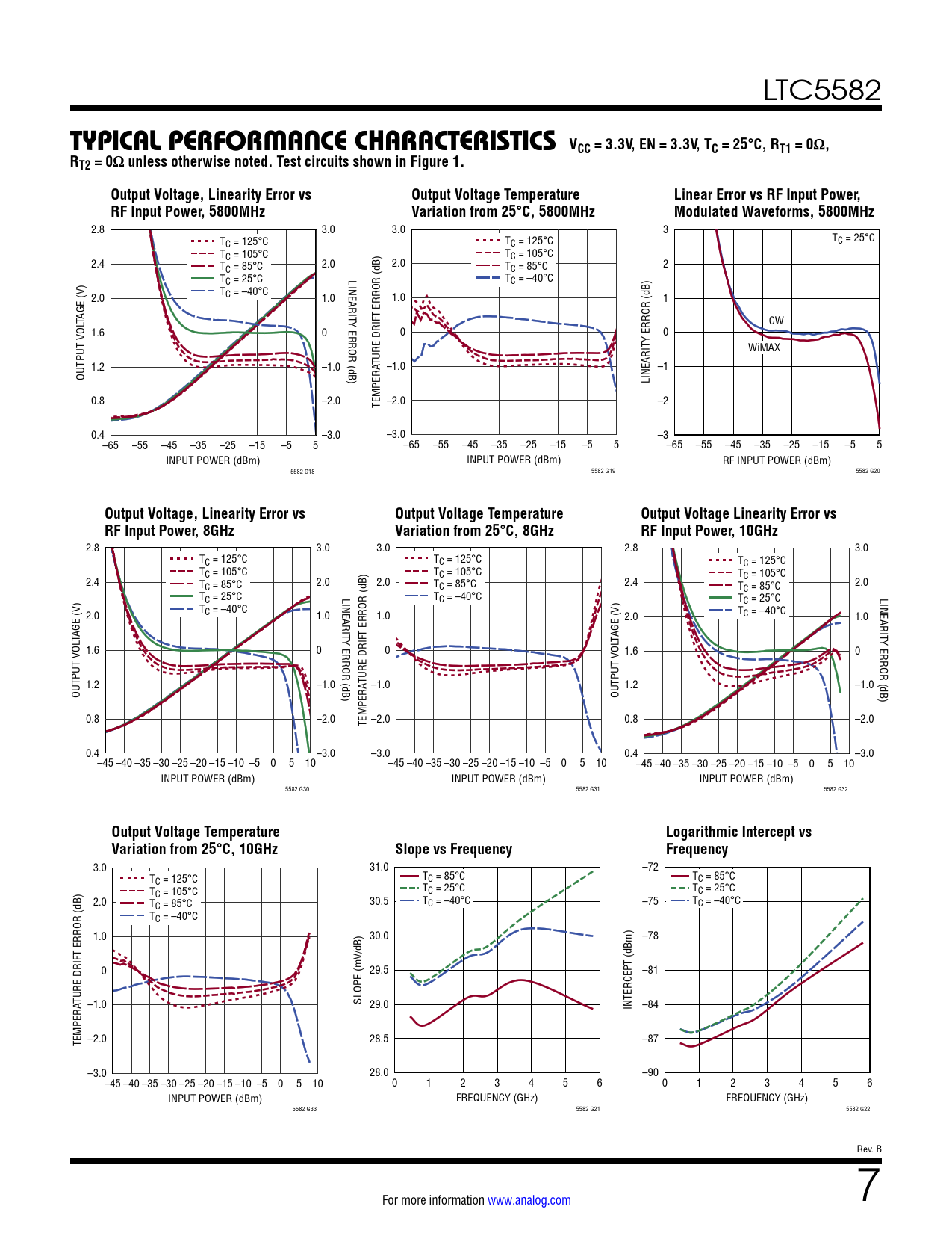 2.8 3.0 3.0 2.8 3.0 TC = 125°C TC = 125°C TC = 125°C TC = 105°C TC = 105°C T 2.4 C = 105°C T 2.0 C = 85°C 2.0 TC = 85°C 2.4 2.0 TC = 85°C T LINEARIT C = 25°C TC = –40°C LINEARIT TC = 25°C T 2.0 C = –40°C 1.0 1.0 2.0 TC = –40°C 1.0 TAGE (V) Y ERROR (dB) T ERROR (dB) TAGE (V) Y ERROR (dB) 1.6 0 0 1.6 0 1.2 –1.0 TURE DRIF –1.0 1.2 –1.0 OUTPUT VOL OUTPUT VOL 0.8 –2.0 –2.0 TEMPERA 0.8 –2.0 0.4 –3.0 –3.0 0.4 –3.0 –45 –40 –35 –30 –25 –20 –15 –10 –5 0 5 10 –45 –40 –35 –30 –25 –20 –15 –10 –5 0 5 10 –45 –40 –35 –30 –25 –20 –15 –10 –5 0 5 10 INPUT POWER (dBm) INPUT POWER (dBm) INPUT POWER (dBm) 5582 G30 5582 G31 5582 G32