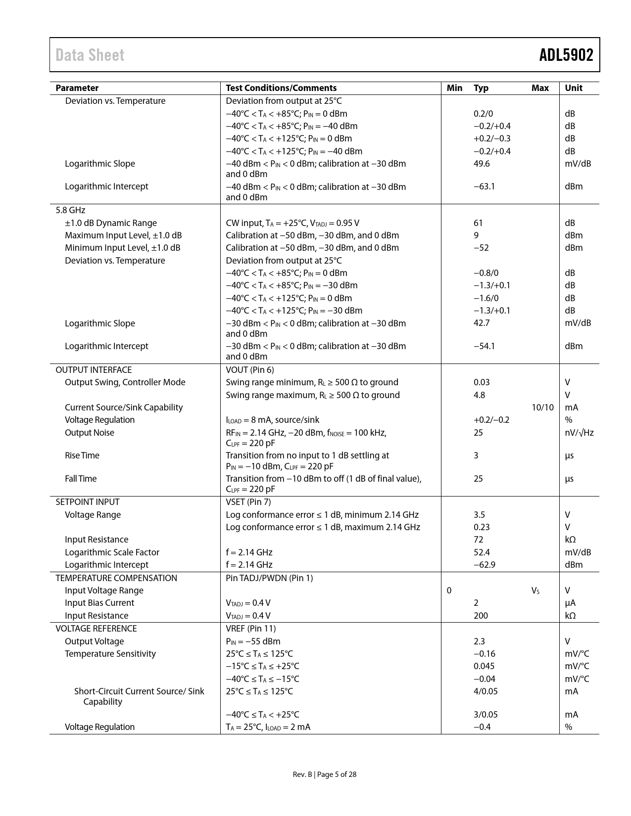 Páginas / Página28 / 5 — Data Sheet. ADL5902. Parameter Test. Conditions/Comments. Min. Typ. Max. …