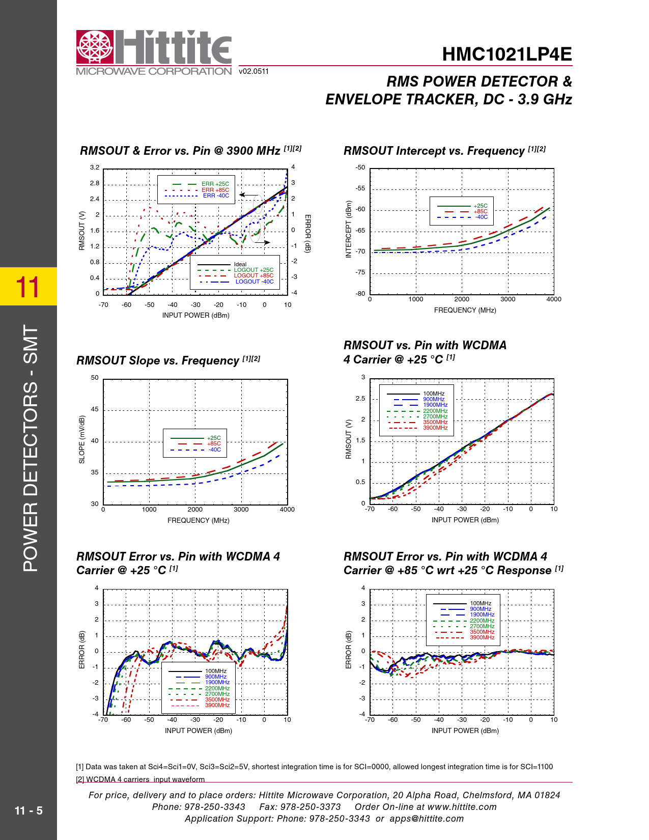Phone: 978-250-3343 Fax: 978-250-3373 Order On-line at www.hittite.com Application Support: Phone: 978-250-3343 or apps@hittite.com Document Outline Typical Applications Features Functional Diagram General Descriptions Electrical Specifications I Electrical Specifications II RMSOUT vs. Pin with Different Modulations @ 1900 MHz RMSOUT Error vs. Pin with Different Modulations @ 1900 MHz Electrical Specifications III Typical Performance Characteristics RMSOUT & Error vs. Pin @ 100 MHz RMSOUT & Error vs. Pin @ 900 MHz RMSOUT & Error vs. Pin @ 1900 MHz RMSOUT & Error vs. Pin @ 2200 MHz RMSOUT & Error vs. Pin @ 2700 MHz RMSOUT & Error vs. Pin @ 3500 MHz RMSOUT & Error vs. Pin @ 3900 MHz RMSOUT Intercept vs. Frequency RMSOUT Slope vs. Frequency RMSOUT vs. Pin with WCDMA 4 Carrier @ +25 °C RMSOUT Error vs. Pin with WCDMA 4 Carrier @ +25 °C RMSOUT Error vs. Pin with WCDMA 4 Carrier @ +85 °C wrt +25 °C Response RMSOUT Error vs. Pin with WCDMA 4 Carrier @ -40 °C wrt +25 °C Response RMSOUT vs. Pin with CW @ +25 °C RMSOUT Error vs. Pin with CW @ +25 °C RMSOUT vs. Pin w/ CW & WCDMA 4 Carrier @ 1900 MHz & +25 °C Reading Error for WCDMA 4 Carrier wrt CW Response @ +25 °C RMSOUT vs. Pin w/ CW & WCDMA 4 Carrier @ 1900 MHz & +85 °C Reading Error for WCDMA 4 Carrier wrt CW Response @ +85 °C RMSOUT vs. Pin w/ CW & WCDMA 4 Carrier @ 1900 MHz & -40 °C Reading Error for WCDMA 4 Carrier wrt CW Response @ -40 °C RMSOUT Output Response with SCI = 0000 @ 1900 MHz RMSOUT Output Response with SCI = 1100 @ 1900 MHz Typical Supply Current vs. Pin, Vcc = 5V Input Return Loss vs. Frequency Output Ripple & Rise/Fall Time vs. Integration Setting [Sci4,Sci3,Sci2,Sci1] in Decimal ETOUT vs. Pin with CW @ 900 MHz ETOUT & ETOUT Error vs. Pin with CW @ 900 MHz ETOUT & ETOUT Error vs. Pin with CW @ 1900 MHz ETOUT vs. Pin with CW @ 3500 MHz ETOUT & ETOUT Error vs. Pin with CW @ 3500 MHz ETOUT Intercept vs. Frequency with CW ETOUT Slope vs. Frequency with CW Absolute Maximum Ratings Outline Drawing Package Information Pin Descriptions Evaluation PCB List of Materials Application Circuit Application Information Principle of Operation Configuration For The Typical Application Broadband Single-Ended Input Interface RMSOUT & Error vs. Pin Envelope Detector Output ETOUT Bandwidth ETOUT Response to an RF Input Signal with a 100 MHz Modulation Bandwidth RMS Output Interface and Transient Response Table 1: Transient Response vs. SCI Setting Rise Time vs. SCI Setting over Input Power Rise Settling Time vs. SCI Setting over Input Power Fall Time vs. SCI Setting over Input Power Residual Ripple for 900 MHz WiMAX @ SCI=0100 Residual Ripple for 900 MHz WiMAX @ SCI=0101 Residual Ripple for 900 MHz WiBRO @ SCI=0100 Residual Ripple for 900 MHz WiBRO@ SCI=0110 Residual Ripple for 900 MHz LTE Downlink @ SCI=0100 Residual Ripple for 900 MHz LTE Downlink @ SCI=0110 Residual Ripple for 900 MHz WCDMA4 @ SCI=0011 Residual Ripple for 900 MHz WCDMA4 @ SCI=0100 LOG-Slope and Intercept Slope Adjustment Intercept Adjustment DC Offset Compensation Loop Standby Mode Modulation Performance - Crest factor performance Reading Error for WCDMA 4 Carrier wrt CW Response @ +25 °C Reading Error for WCDMA 4 Carrier wrt CW Response @ 2200 MHz RMSOUT Error vs. Crest Factor over Frequency System Calibration Layout Considerations Definitions