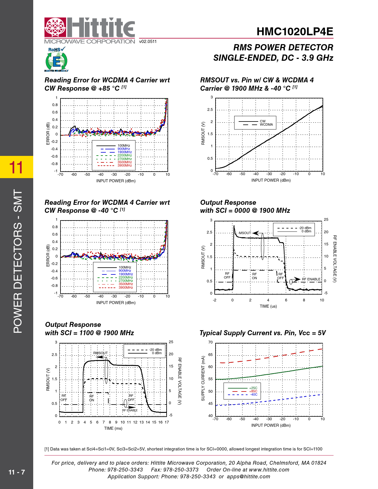 Application Support: Phone: 978-250-3343 or apps@hittite.com Document Outline Typical Applications Features Functional Diagram General Descriptions Electrical Specifications I Electrical Specifications II RMSOUT vs. Pin with Different Modulations @ 1900 MHz RMSOUT Error vs. Pin with Different Modulations @ 1900 MHz Electrical Specifications III Typical Performance Characteristics RMSOUT & Error vs. Pin @ 100 MHz RMSOUT & Error vs. Pin @ 900 MHz RMSOUT & Error vs. Pin @ 1900 MHz RMSOUT & Error vs. Pin @ 2200 MHz RMSOUT & Error vs. Pin @ 2700 MHz RMSOUT & Error vs. Pin @ 3500 MHz RMSOUT & Error vs. Pin @ 3900 MHz Intercept vs. Frequency Slope vs. Frequency RMSOUT vs. Pin with WCDMA 4 Carrier @ +25 °C RMSOUT Error vs. Pin with WCDMA 4 Carrier @ +25 °C RMSOUT Error vs. Pin with WCDMA 4 Carrier @ +85 °C wrt +25 °C Response RMSOUT Error vs. Pin with WCDMA 4 Carrier @ -40 °C wrt +25 °C Response RMSOUT vs. Pin with CW @ +25 °C RMSOUT Error vs. Pin with CW @ +25 °C RMSOUT vs. Pin w/ CW & WCDMA 4 Carrier @ 1900 MHz & +25 °C Reading Error for WCDMA 4 Carrier wrt CW Response @ +25 °C RMSOUT vs. Pin w/ CW & WCDMA 4 Carrier @ 1900 MHz & +85 °C Reading Error for WCDMA 4 Carrier wrt CW Response @ +85 °C RMSOUT vs. Pin w/ CW & WCDMA 4 Carrier @ 1900 MHz & -40 °C Reading Error for WCDMA 4 Carrier wrt CW Response @ -40 °C Output Response with SCI = 0000 @ 1900 MHz Output Response with SCI = 1100 @ 1900 MHz Typical Supply Current vs. Pin, Vcc = 5V Input Return Loss vs. Frequency Output Ripple & Rise/Fall Time vs. Integration Setting [Sci4,Sci3,Sci2,Sci1] in Decimal Absolute Maximum Ratings Outline Drawing Package Information Pin Descriptions Evaluation PCB List of Materials Evaluation Order Information Application Circuit Application Information Principle of Operation Configuration For The Typical Application Broadband Single-Ended Input Interface RMSOUT & Error vs. Pin RMS Output Interface and Transient Response Table 1: Transient Response vs. SCI Setting Rise Time vs. SCI Setting over Input Power Rise Settling Time vs. SCI Setting over Input Power Fall Time vs. SCI Setting over Input Power Residual Ripple for 900 Mhz WiMAX @ SCI=0100 Residual Ripple for 900 Mhz WiMAX @ SCI=0110 Residual Ripple for 900 Mhz WiBRO @ SCI=0100 Residual Ripple for 900 Mhz WiBRO @ SCI=0110 Residual Ripple for 900 Mhz LTE Downlink @ SCI=0100 Residual Ripple for 900 Mhz LTE Downlink @ SCI=0110 Residual Ripple for 900 Mhz WCDMA4 @ SCI=0011 Residual Ripple for 900 Mhz WCDMA4 @ SCI=0100 LOG-Slope and Intercept Slope Adjustment Intercept Adjustment DC Offset Compensation Loop Standby Mode Modulation Performance - Crest factor performance Reading Error for WCDMA 4 Carrier wrt CW Response @ +25 °C Reading Error for WCDMA 4 Carrier wrt CW Response @ 2200MHz RMSOUT Error vs. Crest Factor over Frequency System Calibration Layout Considerations Definitions