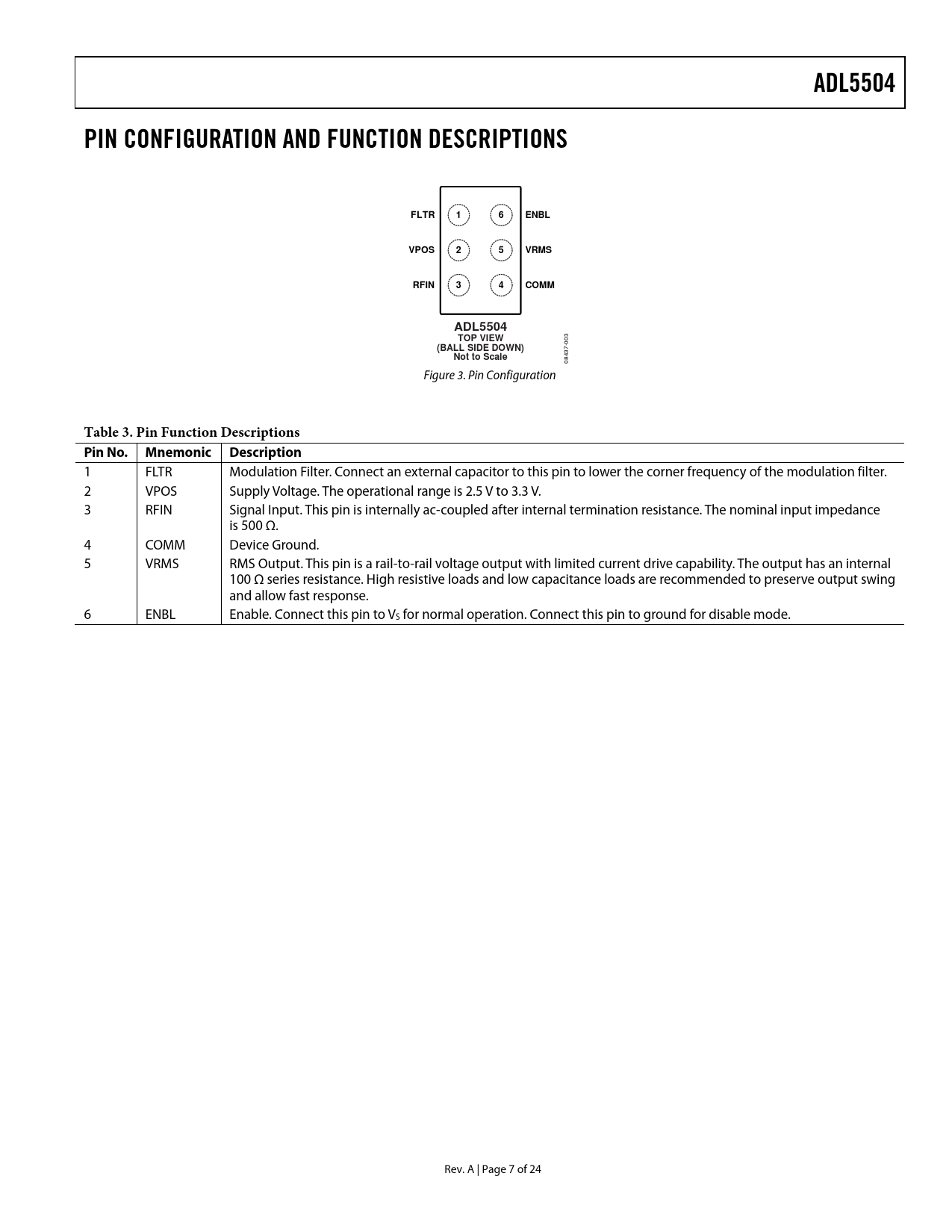 ADL5504. PIN CONFIGURATION AND FUNCTION DESCRIPTIONS. FLTR. ENBL. VPOS. VRMS. RFIN. COMM. TOP VIEW. (BALL SIDE DOWN). Not to Scale
