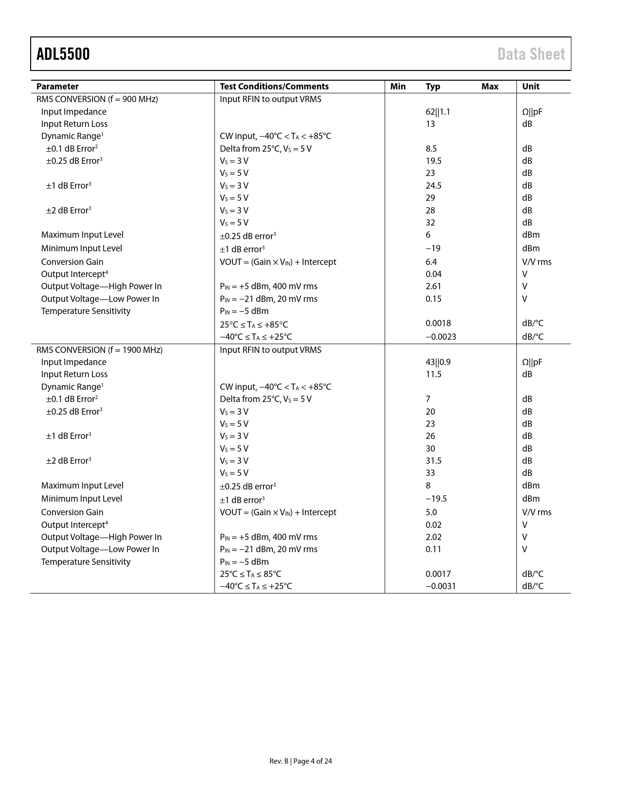 Páginas / Página24 / 4 — ADL5500. Data Sheet. Parameter. Test Conditions/Comments. Min. Typ. Max. …
