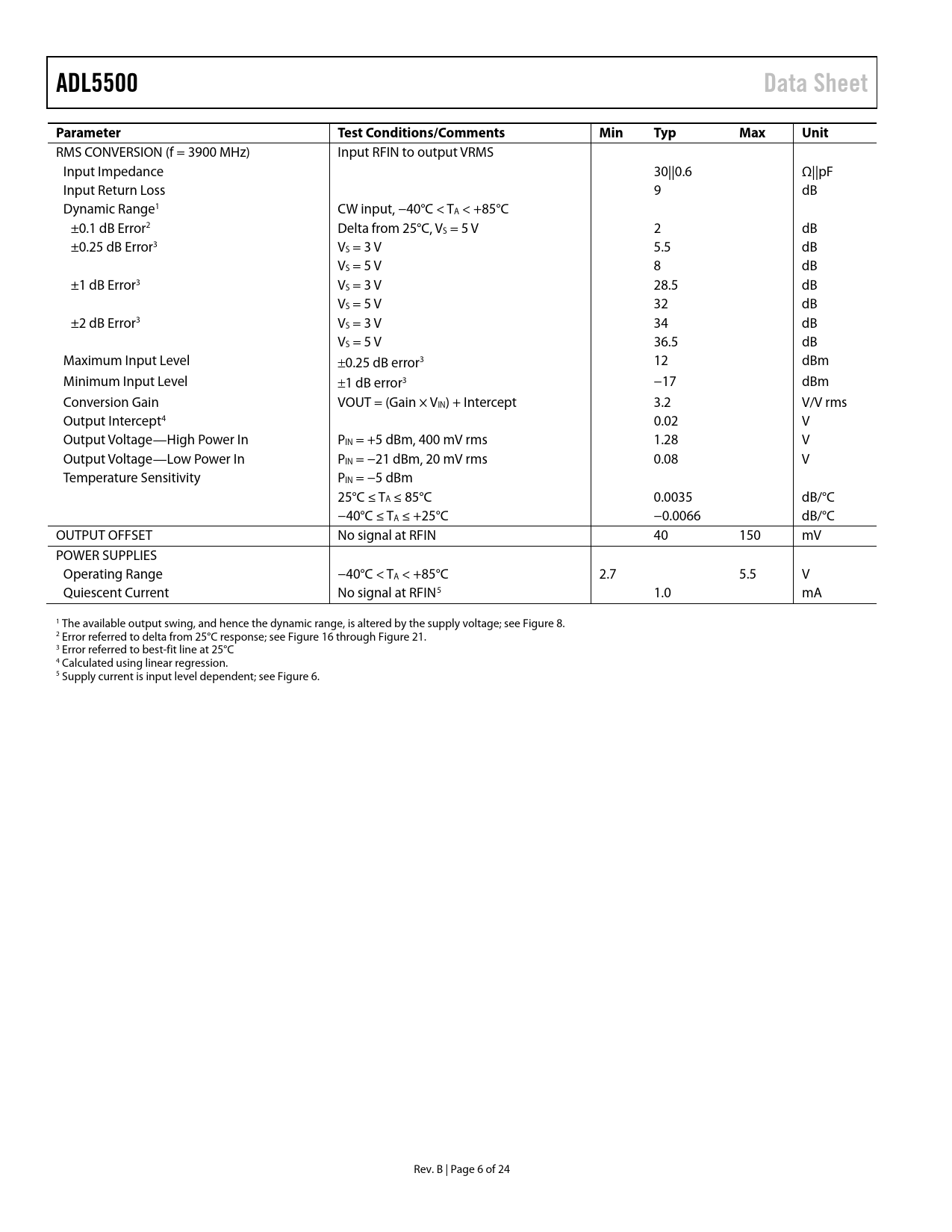 link to page 9 link to page 11 link to page 11 link to page 9 link to page 7 ADL5500Data SheetParameterTest Conditions/CommentsMinTypMaxUnit RMS CONVERSION (f = 3900 MHz) Input RFIN to output VRMS Input Impedance 30||0.6 Ω||pF Input Return Loss 9 dB Dynamic Range1 CW input, −40°C < TA < +85°C ±0.1 dB Error2 Delta from 25°C, VS = 5 V 2 dB ±0.25 dB Error3 VS = 3 V 5.5 dB VS = 5 V 8 dB ±1 dB Error3 VS = 3 V 28.5 dB VS = 5 V 32 dB ±2 dB Error3 VS = 3 V 34 dB VS = 5 V 36.5 dB Maximum Input Level ±0.25 dB error3 12 dBm Minimum Input Level ±1 dB error3 −17 dBm Conversion Gain VOUT = (Gain × VIN) + Intercept 3.2 V/V rms Output Intercept4 0.02 V Output Voltage—High Power In PIN = +5 dBm, 400 mV rms 1.28 V Output Voltage—Low Power In PIN = −21 dBm, 20 mV rms 0.08 V Temperature Sensitivity PIN = −5 dBm 25°C ≤ TA ≤ 85°C 0.0035 dB/°C −40°C ≤ TA ≤ +25°C −0.0066 dB/°C OUTPUT OFFSET No signal at RFIN 40 150 mV POWER SUPPLIES Operating Range −40°C < TA < +85°C 2.7 5.5 V Quiescent Current No signal at RFIN5 1.0 mA 1 The available output swing, and hence the dynamic range, is altered by the supply voltage; see Figure 8. 2 Error referred to delta from 25°C response; see Figure 16 through Figure 21. 3 Error referred to best-fit line at 25°C 4 Calculated using linear regression. 5 Supply current is input level dependent; see Figure 6. Rev. B | Page 6 of 24 Document Outline FEATURES APPLICATIONS GENERAL DESCRIPTION FUNCTIONAL BLOCK DIAGRAM TABLE OF CONTENTS REVISION HISTORY SPECIFICATIONS ABSOLUTE MAXIMUM RATINGS ESD CAUTION PIN CONFIGURATION AND FUNCTION DESCRIPTIONS TYPICAL PERFORMANCE CHARACTERISTICS CIRCUIT DESCRIPTION FILTERING APPLICATIONS INFORMATION BASIC CONNECTIONS OUTPUT SWING LINEARITY INPUT COUPLING USING A SERIES RESISTOR MULTIPLE RF INPUTS SELECTING THE OUTPUT LOW-PASS FILTER NETWORK POWER CONSUMPTION AND POWER-ON/-OFF RESPONSE OUTPUT DRIVE CAPABILITY AND BUFFERING VRMS OUTPUT OFFSET DEVICE CALIBRATION AND ERROR CALCULATION CALIBRATION FOR IMPROVED ACCURACY DRIFT OVER A REDUCED TEMPERATURE RANGE OPERATION ABOVE 4.0 GHz DEVICE HANDLING EVALUATION BOARD Land Pattern and Soldering Information Junction-to-Board Thermal Impedance OUTLINE DIMENSIONS ORDERING GUIDE