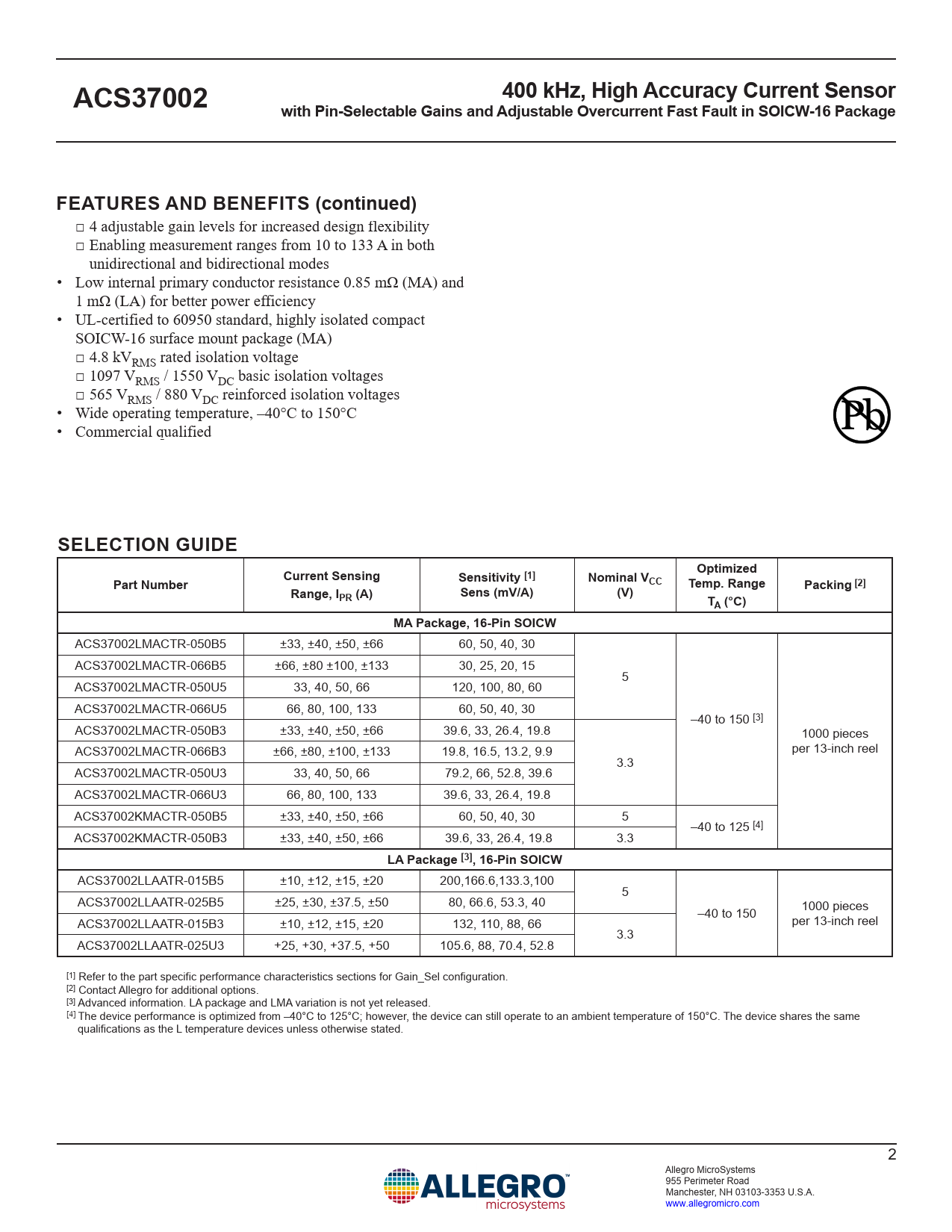 400 kHz, High Accuracy Current Sensor ACS37002 with Pin-Selectable Gains and Adjustable Overcurrent Fast Fault in SOICW-16 Package FEATURES AND BENEFITS (continued)
