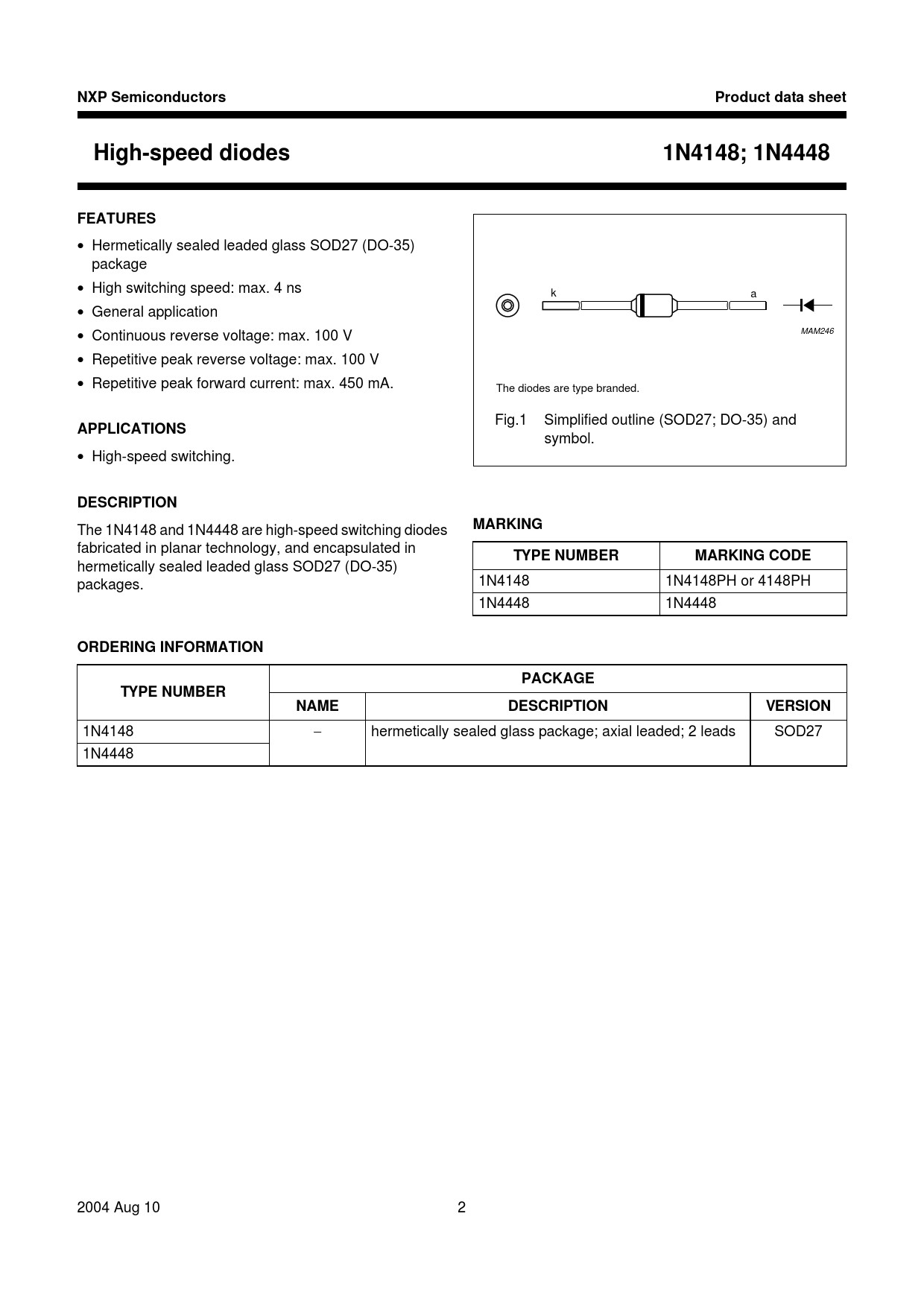NXP Semiconductors. Product data sheet. High-speed diodes. 1N4148; 1N4448. FEATURES. APPLICATIONS. DESCRIPTION. MARKING. TYPE NUMBER