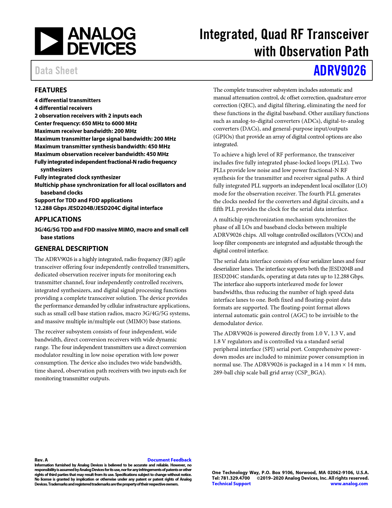 Integrated, Quad RF Transceiver. with Observation Path. Data Sheet. ADRV9026. FEATURES. 4 differential transmitters