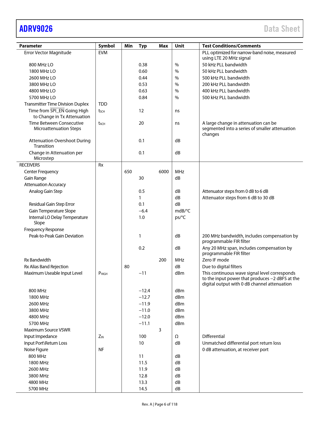 Páginas / Página118 / 6 — ADRV9026. Data Sheet. Parameter. Symbol. Min Typ. Max. Unit. Test …