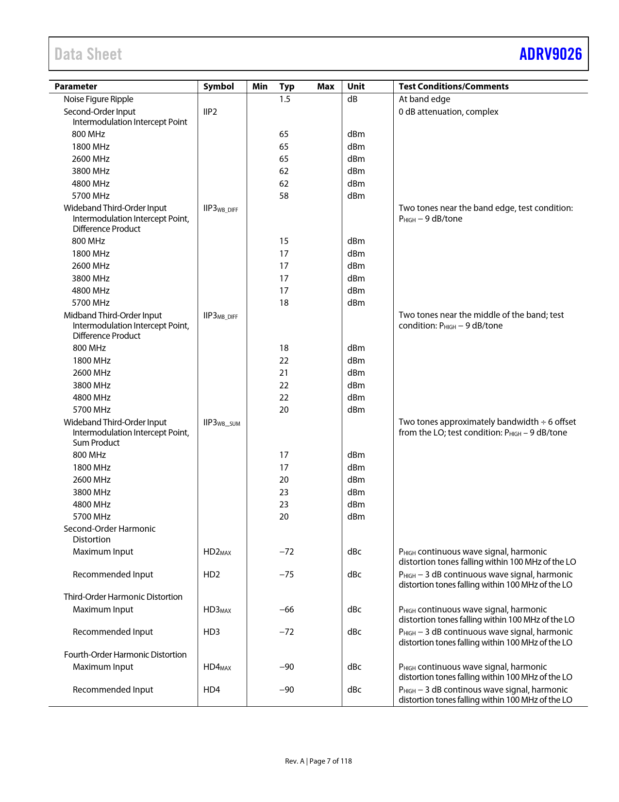 Data Sheet. ADRV9026. Parameter. Symbol. Min Typ. Max. Unit. Test Conditions/Comments