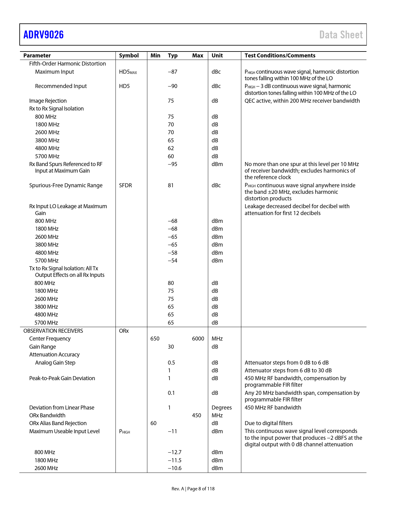 Páginas / Página118 / 8 — ADRV9026. Data Sheet. Parameter. Symbol. Min Typ. Max. Unit. Test …
