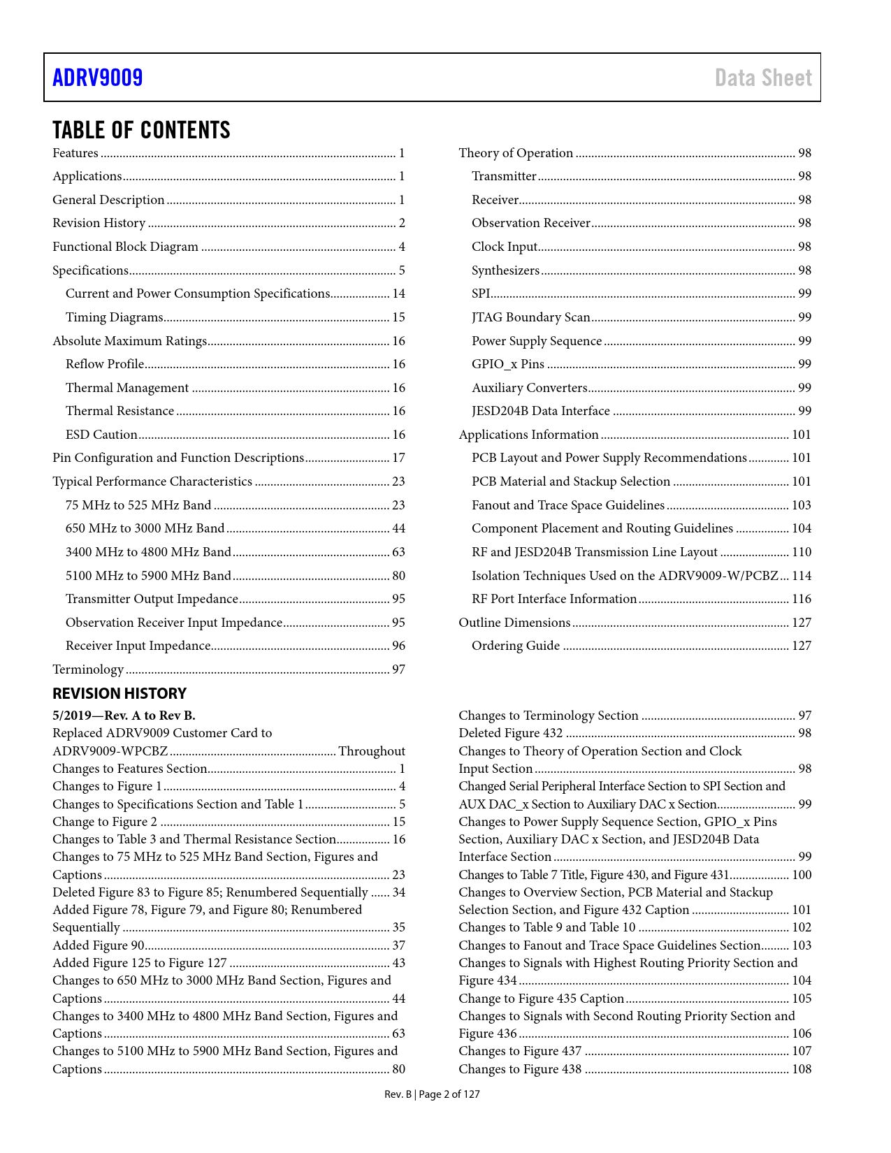 link to page 1 link to page 1 link to page 1 link to page 2 link to page 4 link to page 5 link to page 14 link to page 14 link to page 16 link to page 16 link to page 16 link to page 16 link to page 16 link to page 17 link to page 23 link to page 23 link to page 44 link to page 63 link to page 80 link to page 95 link to page 95 link to page 96 link to page 97 link to page 98 link to page 98 link to page 98 link to page 98 link to page 98 link to page 98 link to page 99 link to page 99 link to page 99 link to page 99 link to page 99 link to page 99 link to page 101 link to page 101 link to page 101 link to page 103 link to page 104 link to page 110 link to page 114 link to page 116 link to page 127 link to page 127 ADRV9009Data SheetTABLE OF CONTENTS Features .. 1 Theory of Operation .. 98 Applications ... 1 Transmitter .. 98 General Description ... 1 Receiver.. 98 Revision History ... 2 Observation Receiver ... 98 Functional Block Diagram .. 4 Clock Input .. 98 Specifications ... 5 Synthesizers ... 98 Current and Power Consumption Specifications ... 14 SPI ... 99 Timing Diagrams .. 15 JTAG Boundary Scan ... 99 Absolute Maximum Ratings .. 16 Power Supply Sequence ... 99 Reflow Profile .. 16 GPIO_x Pins ... 99 Thermal Management ... 16 Auxiliary Converters .. 99 Thermal Resistance .. 16 JESD204B Data Interface .. 99 ESD Caution .. 16 Applications Information .. 101 Pin Configuration and Function Descriptions ... 17 PCB Layout and Power Supply Recommendations ... 101 Typical Performance Characteristics ... 23 PCB Material and Stackup Selection ... 101 75 MHz to 525 MHz Band .. 23 Fanout and Trace Space Guidelines ... 103 650 MHz to 3000 MHz Band .. 44 Component Placement and Routing Guidelines ... 104 3400 MHz to 4800 MHz Band .. 63 RF and JESD204B Transmission Line Layout .. 110 5100 MHz to 5900 MHz Band .. 80 Isolation Techniques Used on the ADRV9009-W/PCBZ ... 114 Transmitter Output Impedance .. 95 RF Port Interface Information .. 116 Observation Receiver Input Impedance .. 95 Outline Dimensions ... 127 Receiver Input Impedance... 96 Ordering Guide .. 127 Terminology .. 97 REVISION HISTORY5/2019—Rev. A to Rev B. Changes to Terminology Section ... 97 Replaced ADRV9009 Customer Card to Deleted Figure 432 ... 98 ADRV9009-WPCBZ ... Throughout Changes to Theory of Operation Section and Clock Changes to Features Section.. 1 Input Section ... 98 Changes to Figure 1 .. 4 Changed Serial Peripheral Interface Section to SPI Section and Changes to Specifications Section and Table 1 ... 5 AUX DAC_x Section to Auxiliary DAC x Section ... 99 Change to Figure 2 ... 15 Changes to Power Supply Sequence Section, GPIO_x Pins Changes to Table 3 and Thermal Resistance Section ... 16 Section, Auxiliary DAC x Section, and JESD204B Data Changes to 75 MHz to 525 MHz Band Section, Figures and Interface Section ... 99 Captions ... 23 Changes to Table 7 Title, Figure 430, and Figure 431... 100 Deleted Figure 83 to Figure 85; Renumbered Sequentially .. 34 Changes to Overview Section, PCB Material and Stackup Added Figure 78, Figure 79, and Figure 80; Renumbered Selection Section, and Figure 432 Caption ... 101 Sequentially ... 35 Changes to Table 9 and Table 10 .. 102 Added Figure 90 .. 37 Changes to Fanout and Trace Space Guidelines Section ... 103 Added Figure 125 to Figure 127 ... 43 Changes to Signals with Highest Routing Priority Section and Changes to 650 MHz to 3000 MHz Band Section, Figures and Figure 434 .. 104 Captions ... 44 Change to Figure 435 Caption .. 105 Changes to 3400 MHz to 4800 MHz Band Section, Figures and Changes to Signals with Second Routing Priority Section and Captions ... 63 Figure 436 .. 106 Changes to 5100 MHz to 5900 MHz Band Section, Figures and Changes to Figure 437 ... 107 Captions ... 80 Changes to Figure 438 ... 108 Rev. B | Page 2 of 127 Document Outline Features Applications General Description Revision History Functional Block Diagram Specifications Current and Power Consumption Specifications Timing Diagrams Absolute Maximum Ratings Reflow Profile Thermal Management Thermal Resistance ESD Caution Pin Configuration and Function Descriptions Typical Performance Characteristics 75 MHz to 525 MHz Band 650 MHz to 3000 MHz Band 3400 MHz to 4800 MHz Band 5100 MHz to 5900 MHz Band Transmitter Output Impedance Observation Receiver Input Impedance Receiver Input Impedance Terminology Theory of Operation Transmitter Receiver Observation Receiver Clock Input Synthesizers RF PLL Clock PLL SPI JTAG Boundary Scan Power Supply Sequence GPIO_x Pins Auxiliary Converters AUXADC_x Auxiliary DAC x JESD204B Data Interface Applications Information PCB Layout and Power Supply Recommendations Overview PCB Material and Stackup Selection Fanout and Trace Space Guidelines Component Placement and Routing Guidelines Signals with Highest Routing Priority Signals with Second Routing Priority Signals with Lowest Routing Priority RF and JESD204B Transmission Line Layout RF Routing Guidelines Transmitter Balun DC Feed Supplies JESD204B Trace Routing Recommendations Routing Recommendations Stripline Transmission Lines vs. Microstrip Transmission Lines Isolation Techniques Used on the ADRV9009-W/PCBZ Isolation Goals Isolation Between JESD204B Lines RF Port Interface Information RF Port Impedance Data Advanced Design System (ADS) Setup Using the DataAccessComponent and SEDZ File Transmitter Bias and Port Interface General Receiver Path Interface Impedance Matching Network Examples Outline Dimensions Ordering Guide