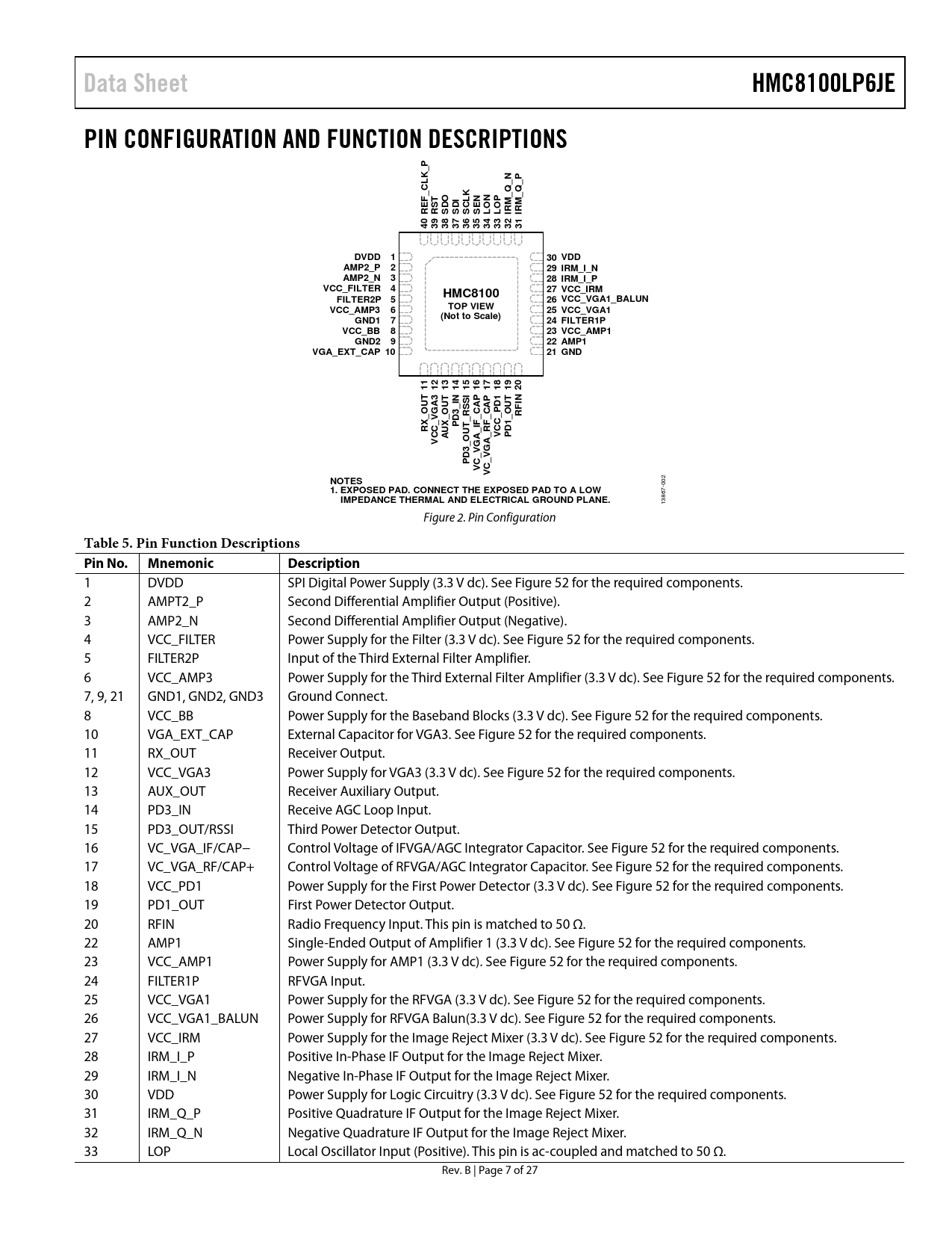 Data Sheet HMC8100LP6JE PIN CONFIGURATION AND FUNCTION DESCRIPTIONS K_P N P _ _ CL Q Q _ K _ _ F T O I L N P M M RE RS SD SD SC SEN LO LO IR IR 40 39 38 37 36 35 34 33 32 31 DVDD 1 30 VDD AMP2_P 2 29 IRM_I_N AMP2_N 3 28 IRM_I_P VCC_FILTER 4 27 VCC_IRM HMC8100 FILTER2P 5 26 VCC_VGA1_BALUN VCC_AMP3 6 TOP VIEW 25 VCC_VGA1 GND1 7 (Not to Scale) 24 FILTER1P VCC_BB 8 23 VCC_AMP1 GND2 9 22 AMP1 VGA_EXT_CAP 10 21 GND 11 12 13 14 15 16 17 18 19 20 T 3 1 T U A IN UT IN _ D U G SSI O 3 R CAP CAP O _ RF _ _ _ _ PD T F F 1 RX_O _I CC_P CC_V U AUX A _R V PD V O _ G A 3 V G _ V PD C _ V C V