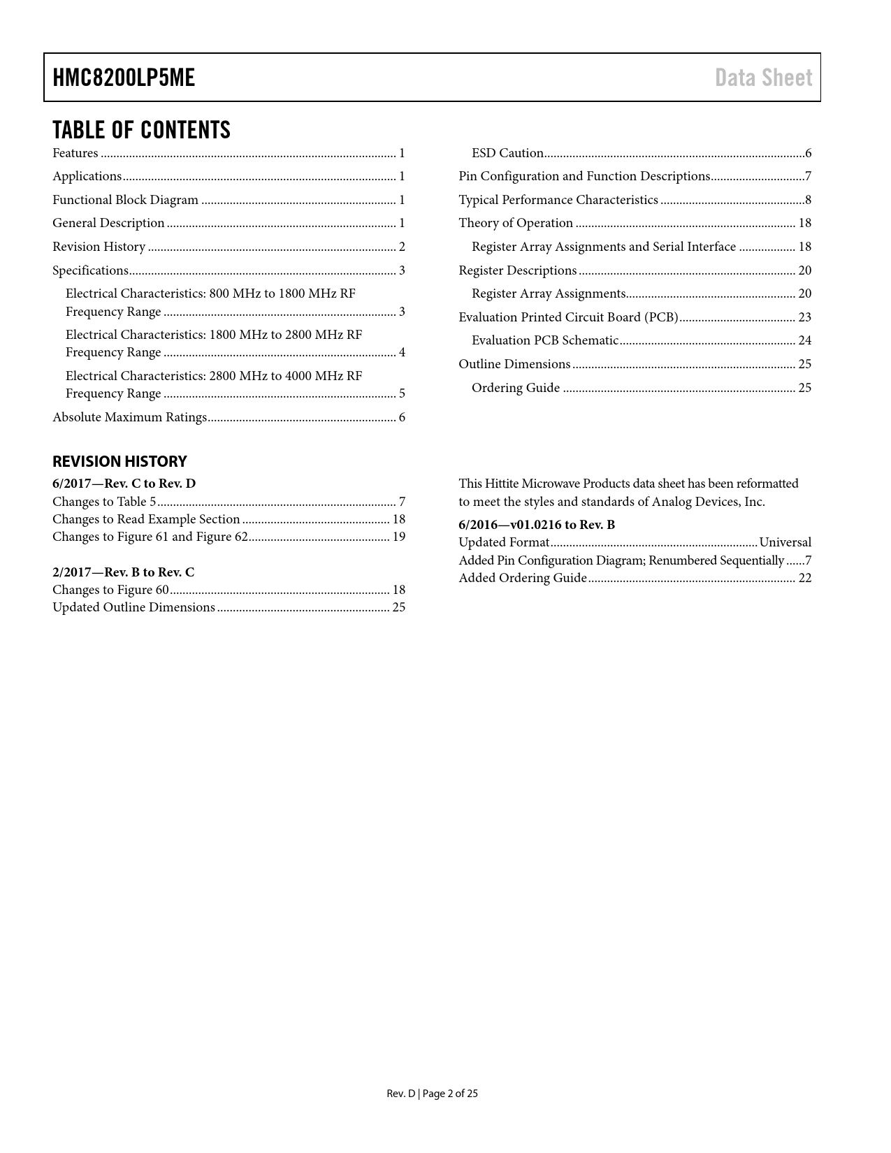 link to page 1 link to page 1 link to page 1 link to page 1 link to page 2 link to page 3 link to page 3 link to page 3 link to page 4 link to page 4 link to page 5 link to page 5 link to page 6 link to page 6 link to page 7 link to page 8 link to page 18 link to page 18 link to page 20 link to page 20 link to page 23 link to page 24 link to page 25 link to page 25 HMC8200LP5MEData SheetTABLE OF CONTENTS Features .. 1 ESD Caution...6 Applications ... 1 Pin Configuration and Function Descriptions ..7 Functional Block Diagram .. 1 Typical Performance Characteristics ..8 General Description ... 1 Theory of Operation .. 18 Revision History ... 2 Register Array Assignments and Serial Interface .. 18 Specifications ... 3 Register Descriptions ... 20 Electrical Characteristics: 800 MHz to 1800 MHz RF Register Array Assignments.. 20 Frequency Range .. 3 Evaluation Printed Circuit Board (PCB) ... 23 Electrical Characteristics: 1800 MHz to 2800 MHz RF Evaluation PCB Schematic .. 24 Frequency Range .. 4 Outline Dimensions ... 25 Electrical Characteristics: 2800 MHz to 4000 MHz RF Frequency Range .. 5 Ordering Guide .. 25 Absolute Maximum Ratings .. 6 REVISION HISTORY 6/2017—Rev. C to Rev. D This Hittite Microwave Products data sheet has been reformatted Changes to Table 5 .. 7 to meet the styles and standards of Analog Devices, Inc. Changes to Read Example Section ... 18 6/2016—v01.0216 to Rev. B Changes to Figure 61 and Figure 62 ... 19 Updated Format .. Universal Added Pin Configuration Diagram; Renumbered Sequentially .. 7 2/2017—Rev. B to Rev. C Added Ordering Guide .. 22 Changes to Figure 60 .. 18 Updated Outline Dimensions ... 25 Rev. D | Page 2 of 25 Document Outline Features Applications Functional Block Diagram General Description Revision History Specifications Electrical Characteristics: 800 MHz to 1800 MHz RF Frequency Range Electrical Characteristics: 1800 MHz to 2800 MHz RF Frequency Range Electrical Characteristics: 2800 MHz to 4000 MHz RF Frequency Range Absolute Maximum Ratings ESD Caution Pin Configuration and Function Descriptions Typical Performance Characteristics Theory of Operation Register Array Assignments and Serial Interface Read Example Register Descriptions Register Array Assignments Enable Bits Digital Gain Amplifier: DGA Control Digital Gain Amplifier: Amplifier Current, Envelope Level, and VGA Attenuation Bias Image Reject Mixer: Sideband, and Polarity and Offset for I Image Reject Mixer: Polarity and Offset for Q Phase I: Adjust Phase Q: Adjust Evaluation Printed Circuit Board (PCB) Evaluation PCB Schematic Outline Dimensions Ordering Guide