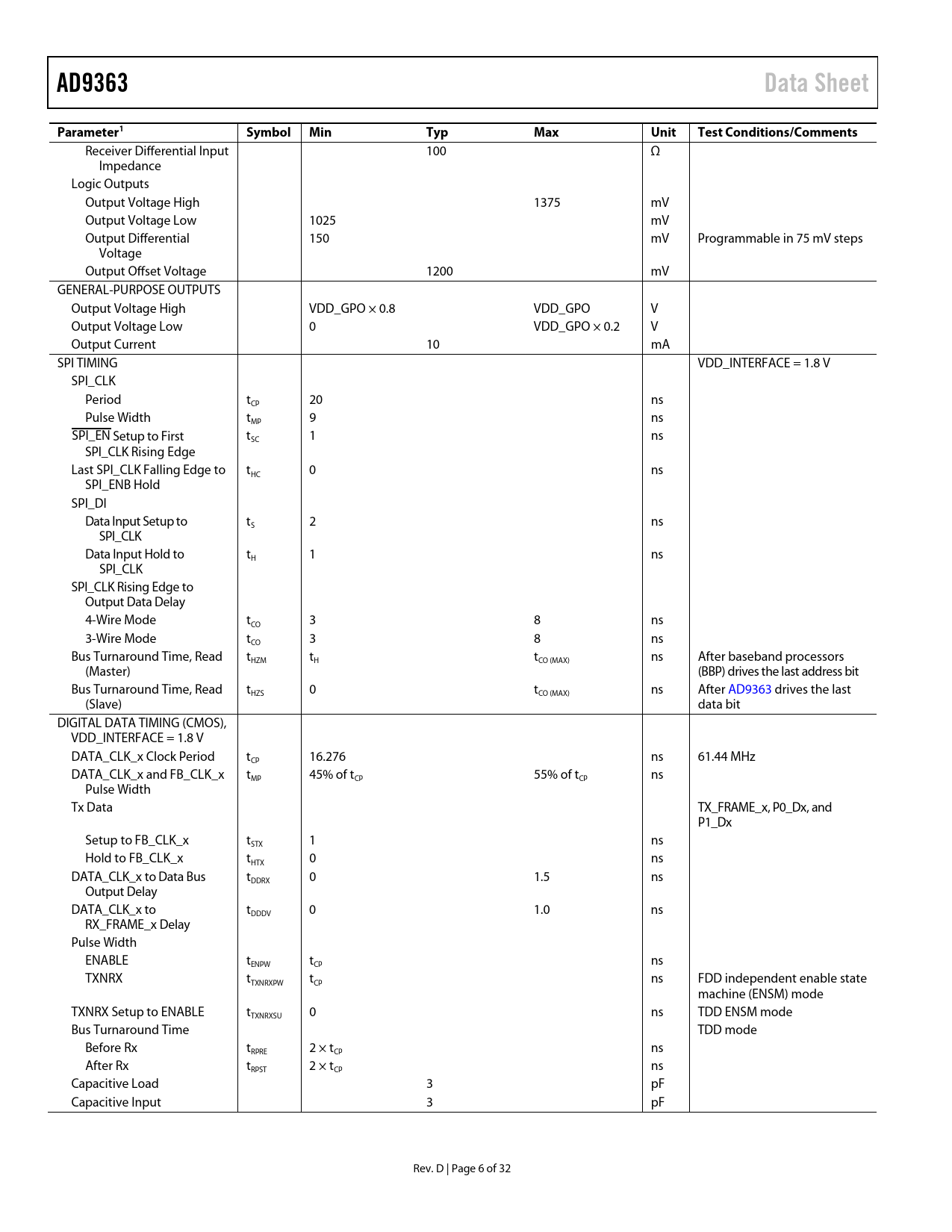 AD9363. Data Sheet. Parameter1. Symbol. Min. Typ. Max. Unit. Test Conditions/Comments