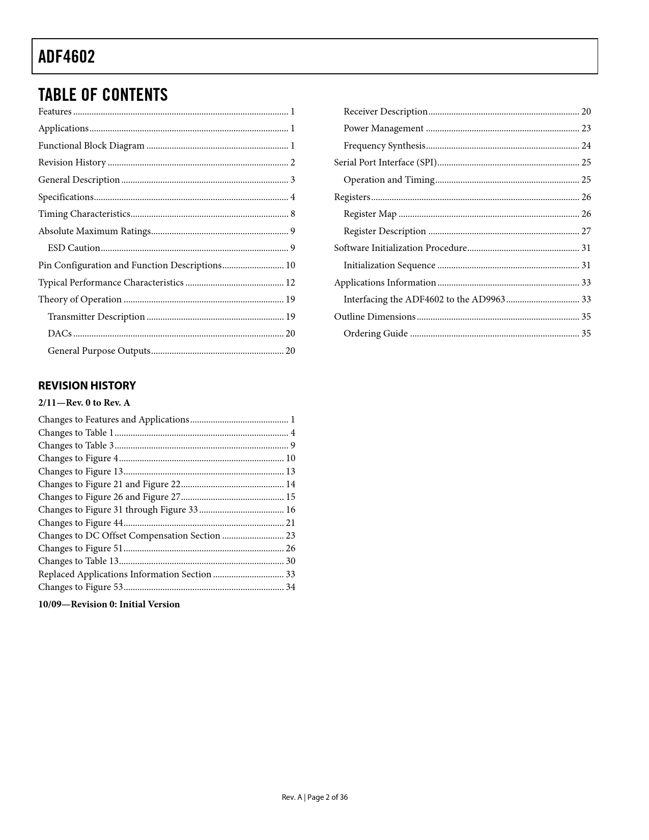 Páginas / Página36 / 2 — ADF4602. TABLE OF CONTENTS. REVISION HISTORY. 2/11—Rev. 0 to Rev. A. …